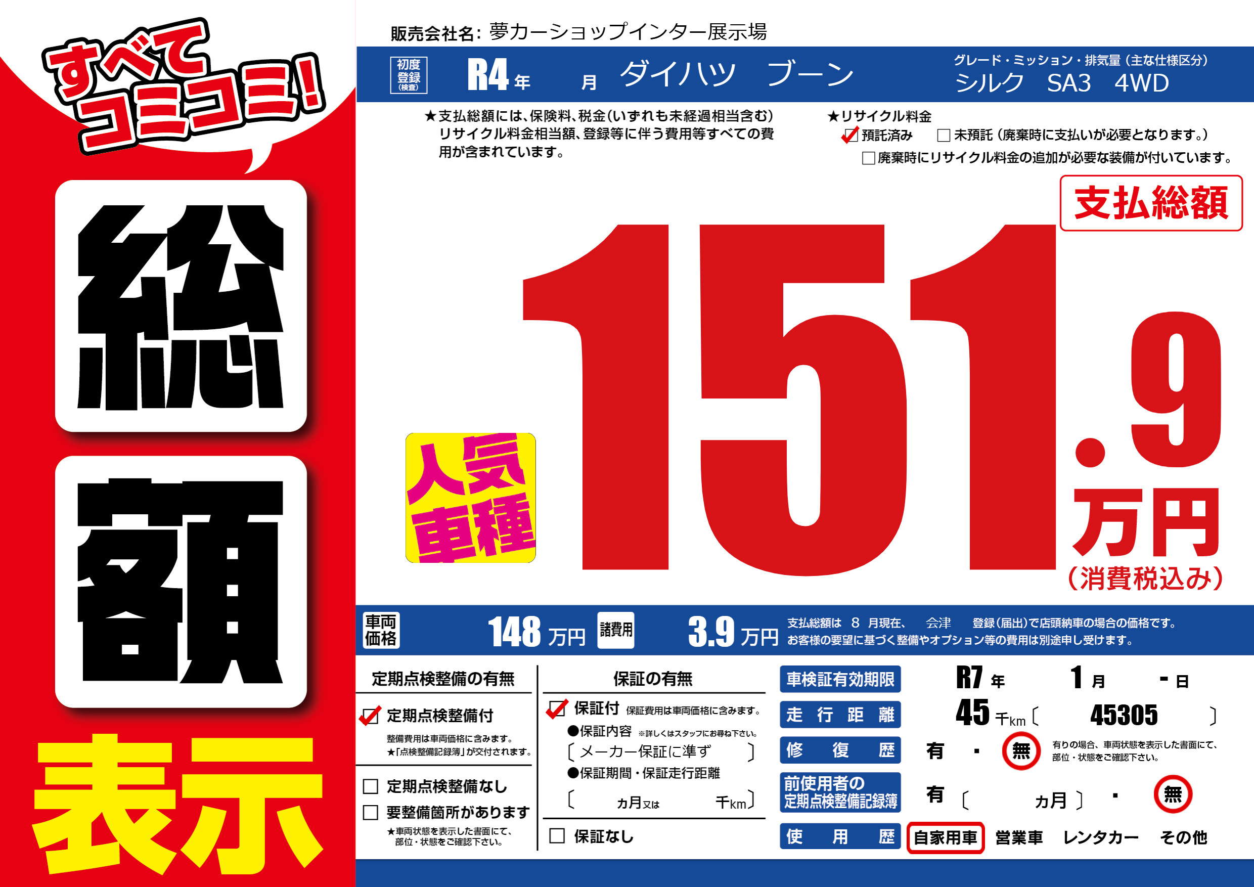 | 車名 | ダイハツ ブーン | グレード ミッション 排気量 |