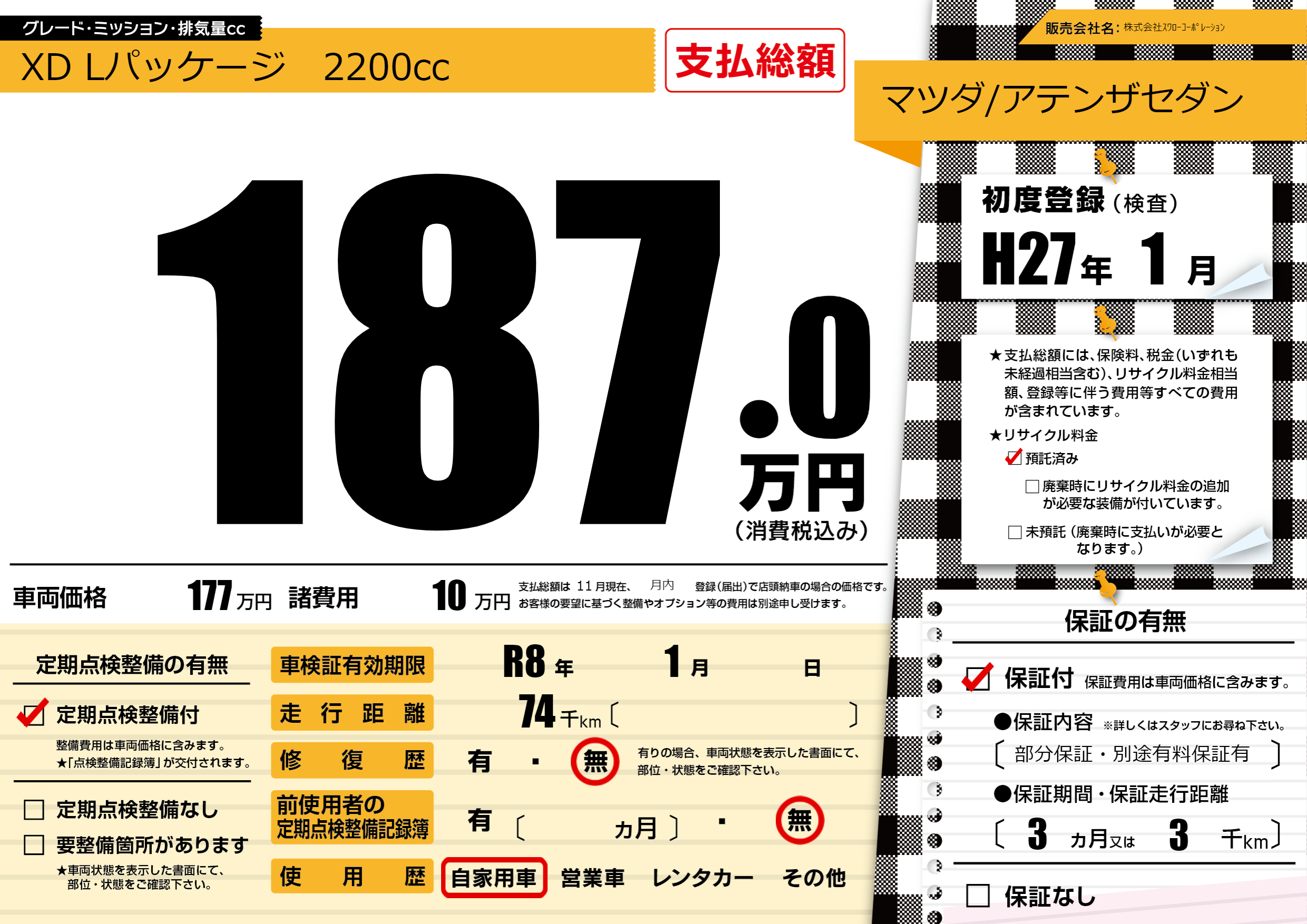 | 車名 | マツダ/アテンザセダン | グレード ミッション 排気量 |