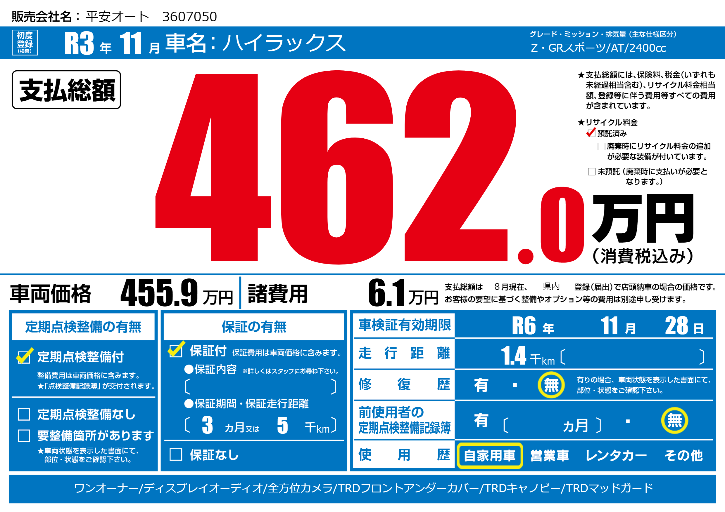 | 走行キロ | 0.1万km | 初年度登録 | R3年11月 |