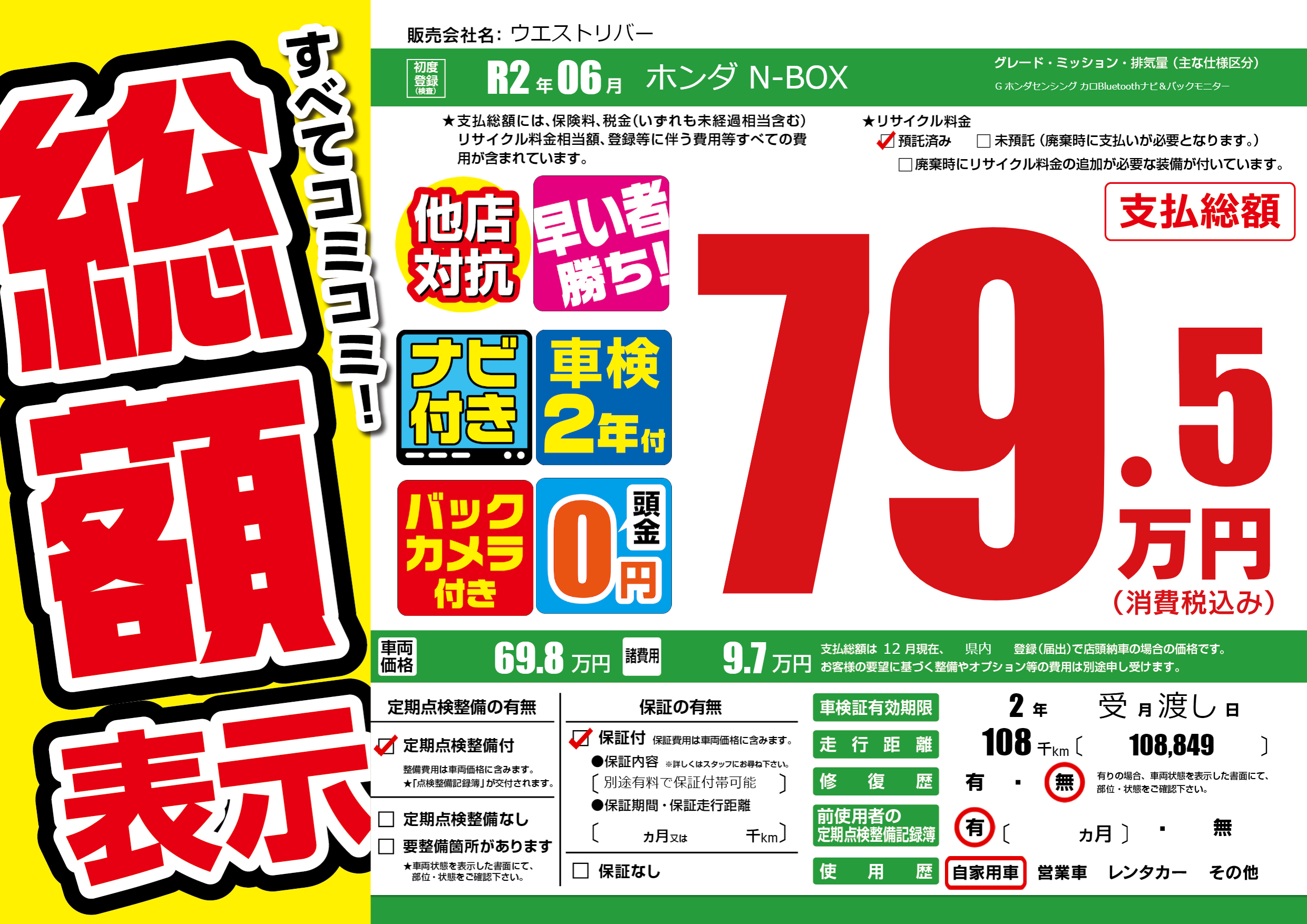 | 車名 | ホンダ N-BOX | グレード ミッション 排気量 |