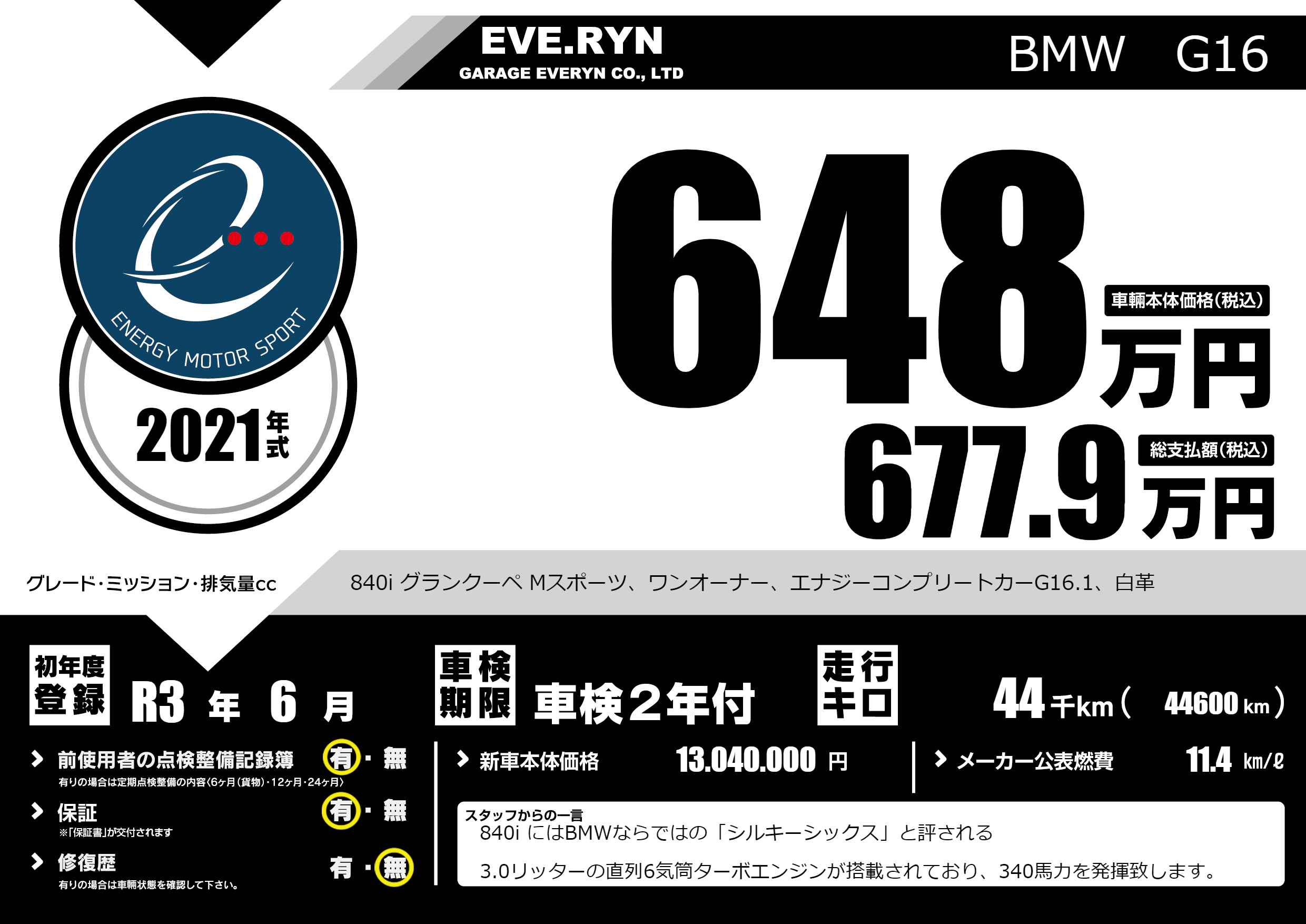 840i グランクーペ Mスポーツ、ワンオーナー、エナジーコンプリートカーG16.1、白革 |