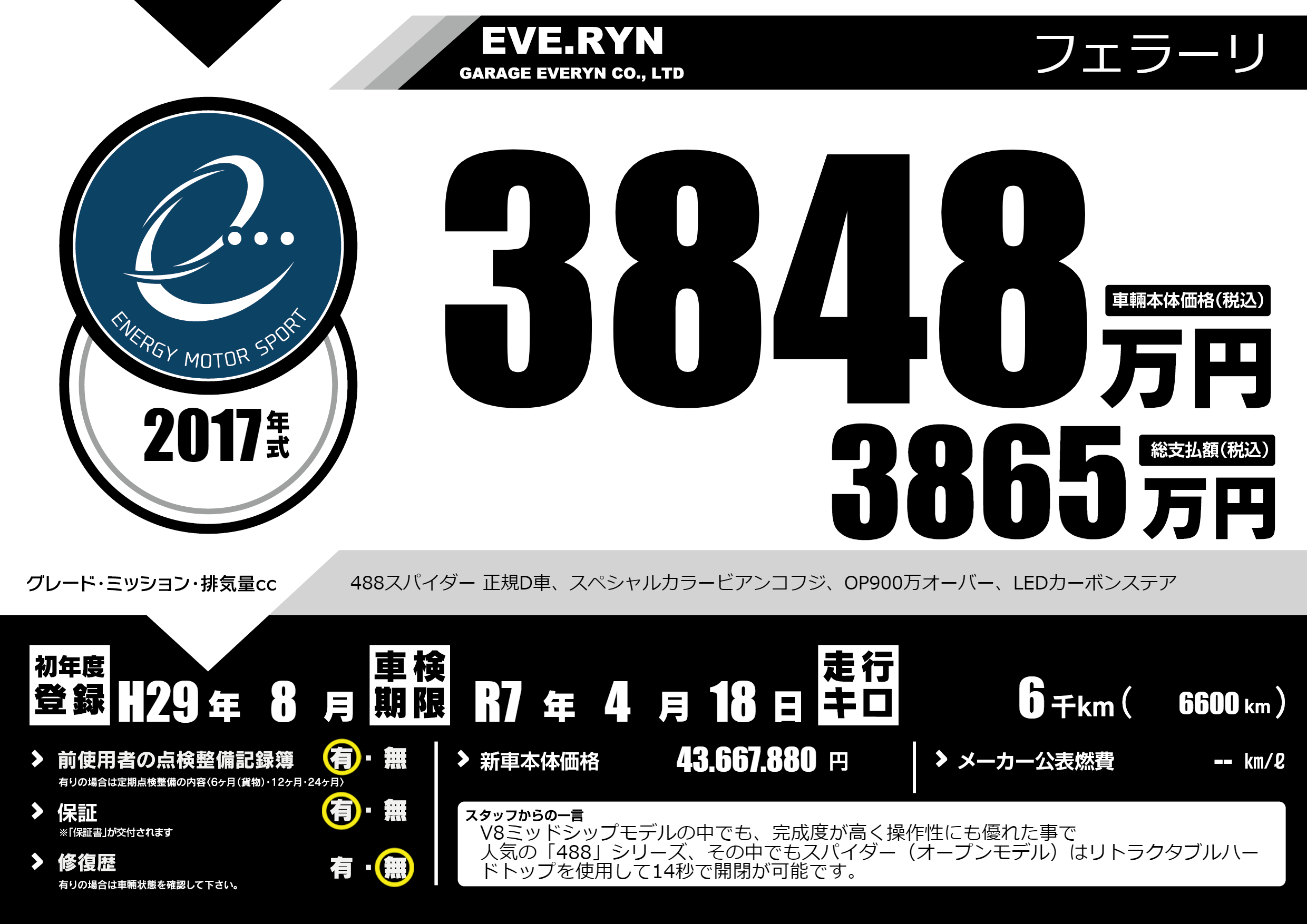 488スパイダー 正規D車、スペシャルカラービアンコフジ、OP900万オーバー、LEDカーボンステア |