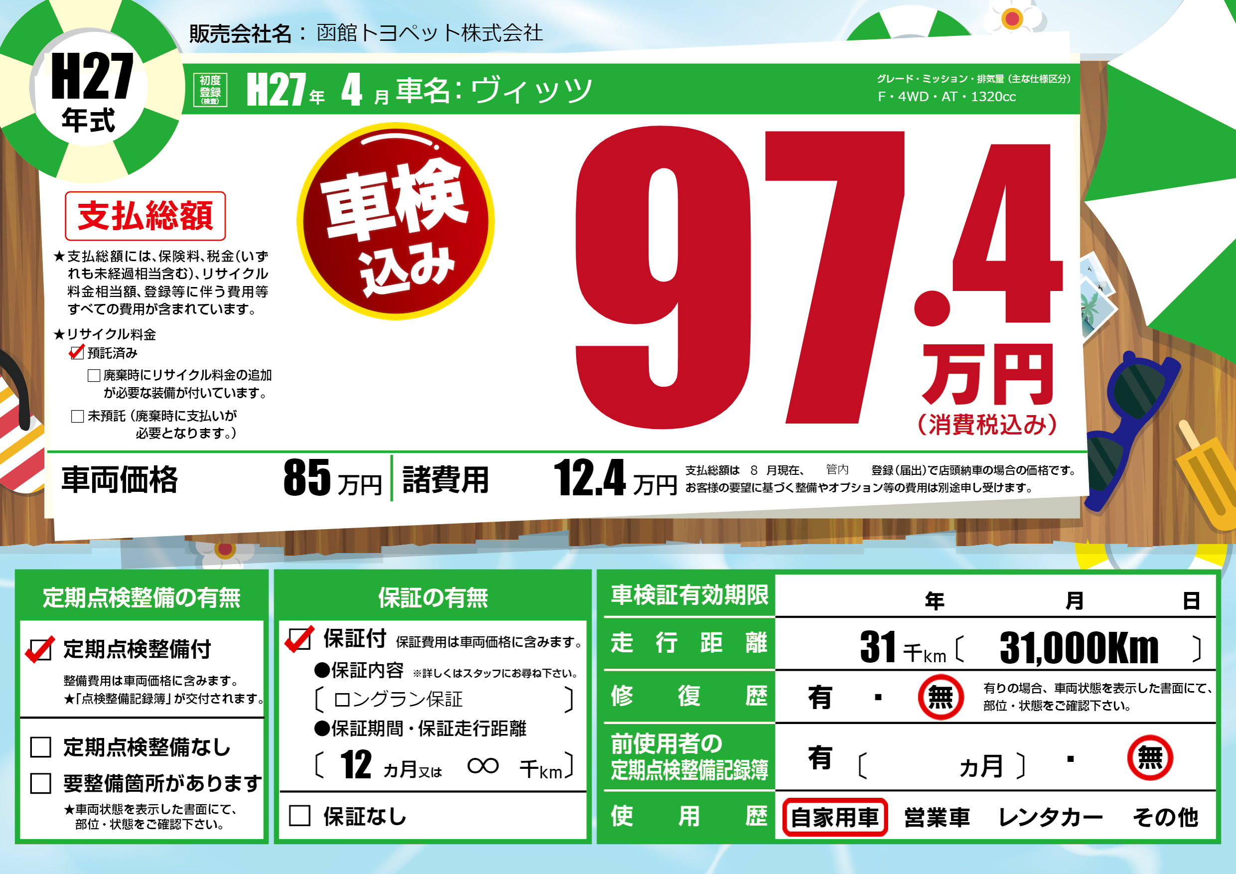 | 車名 | ヴィッツ | グレード ミッション 排気量 |