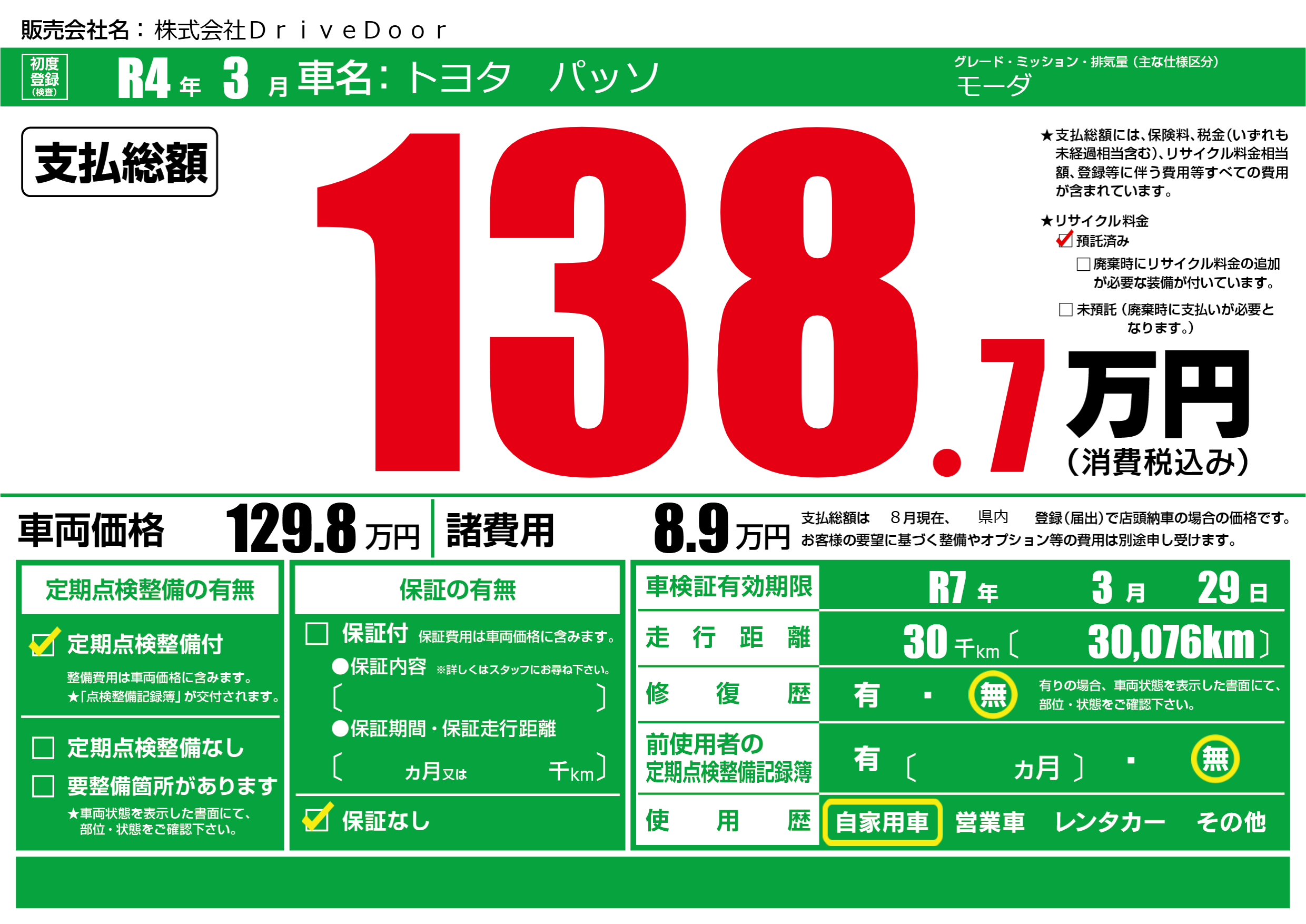 | リサイクル料金 預託済 |
