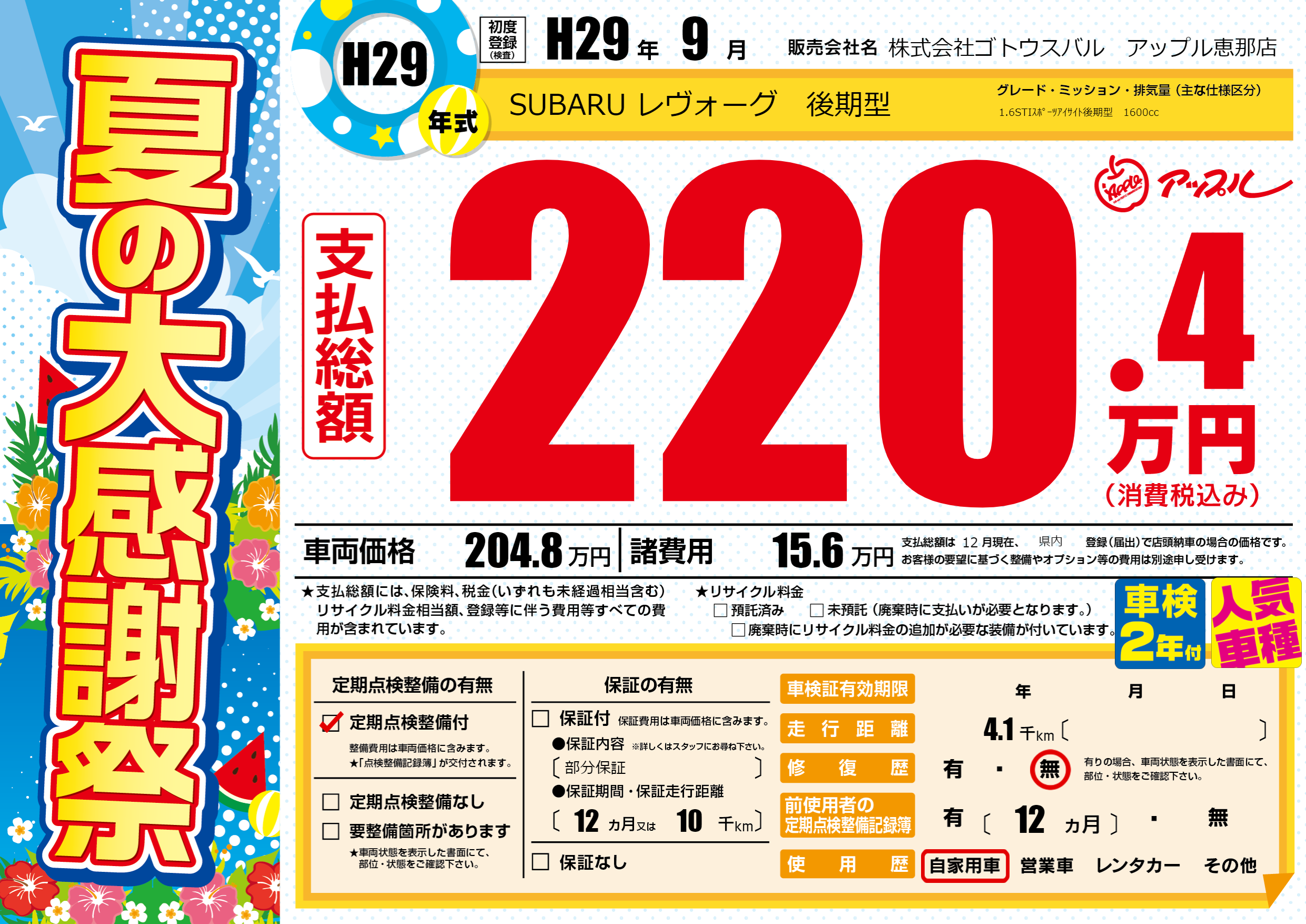 | 車名 | SUBARU レヴォーグ 後期型 | グレード ミッション 排気量 |