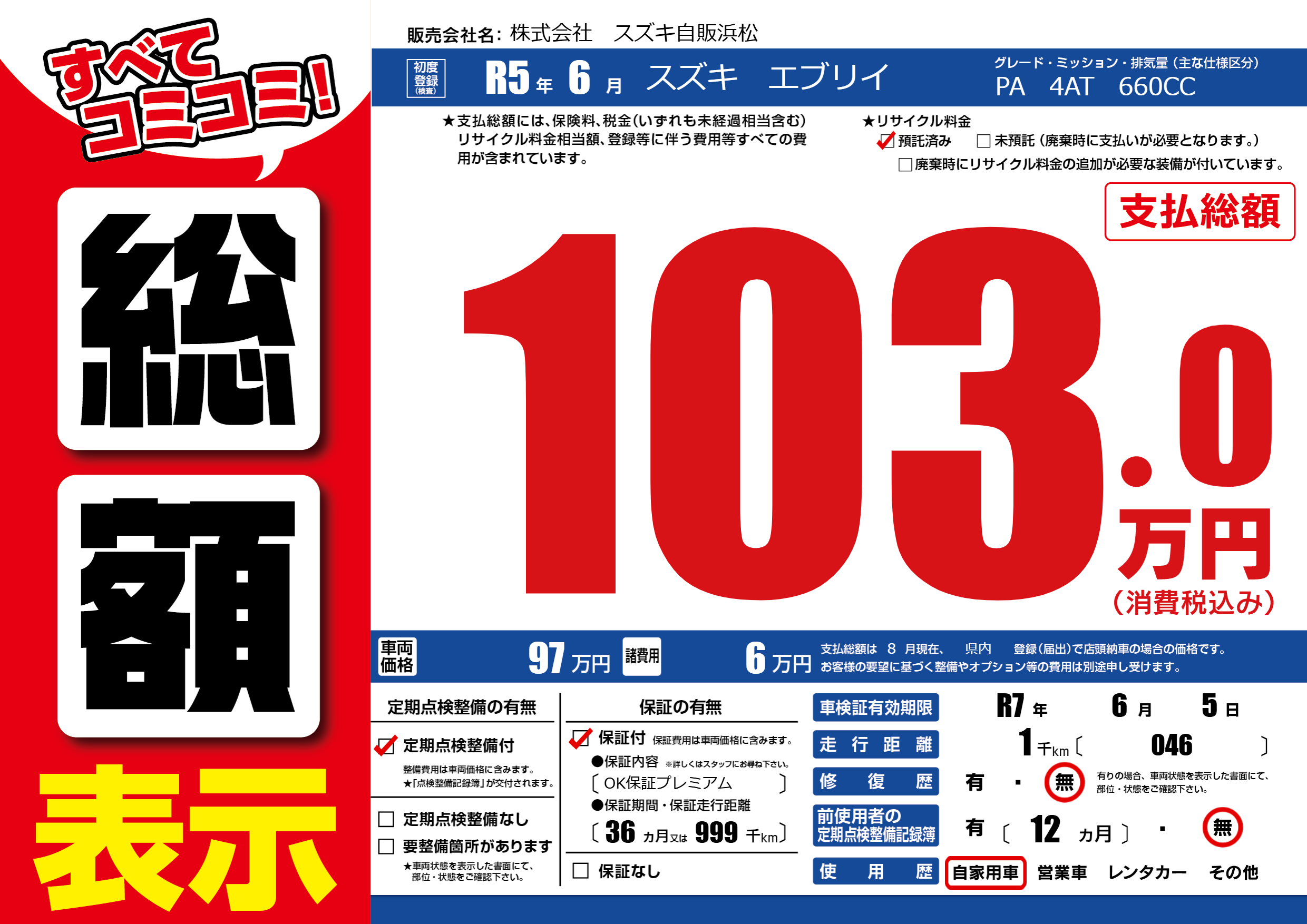 | 車名 | スズキ エブリイ | グレード ミッション 排気量 |