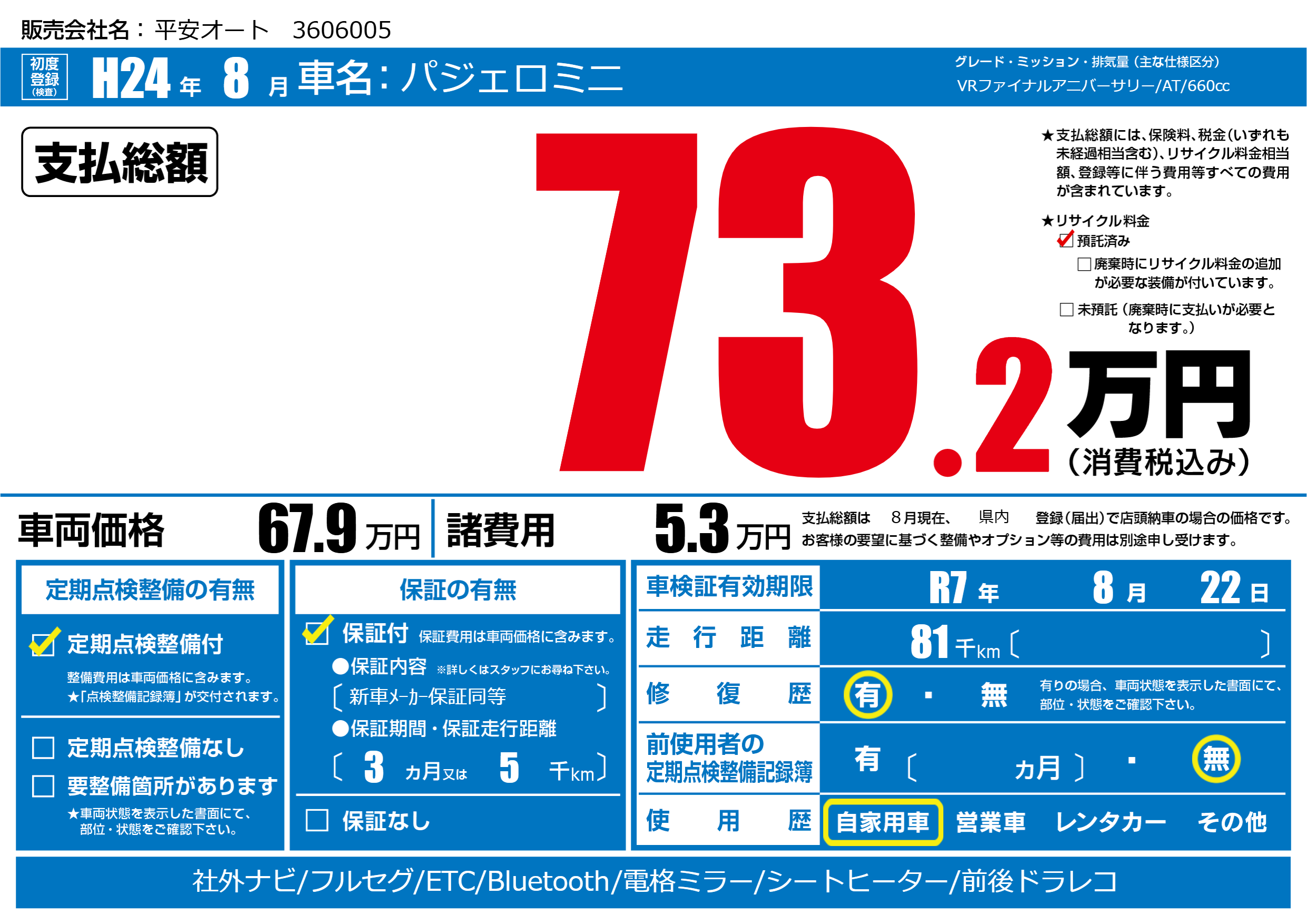 | 車名 | パジェロミニ | グレード ミッション 排気量 |
