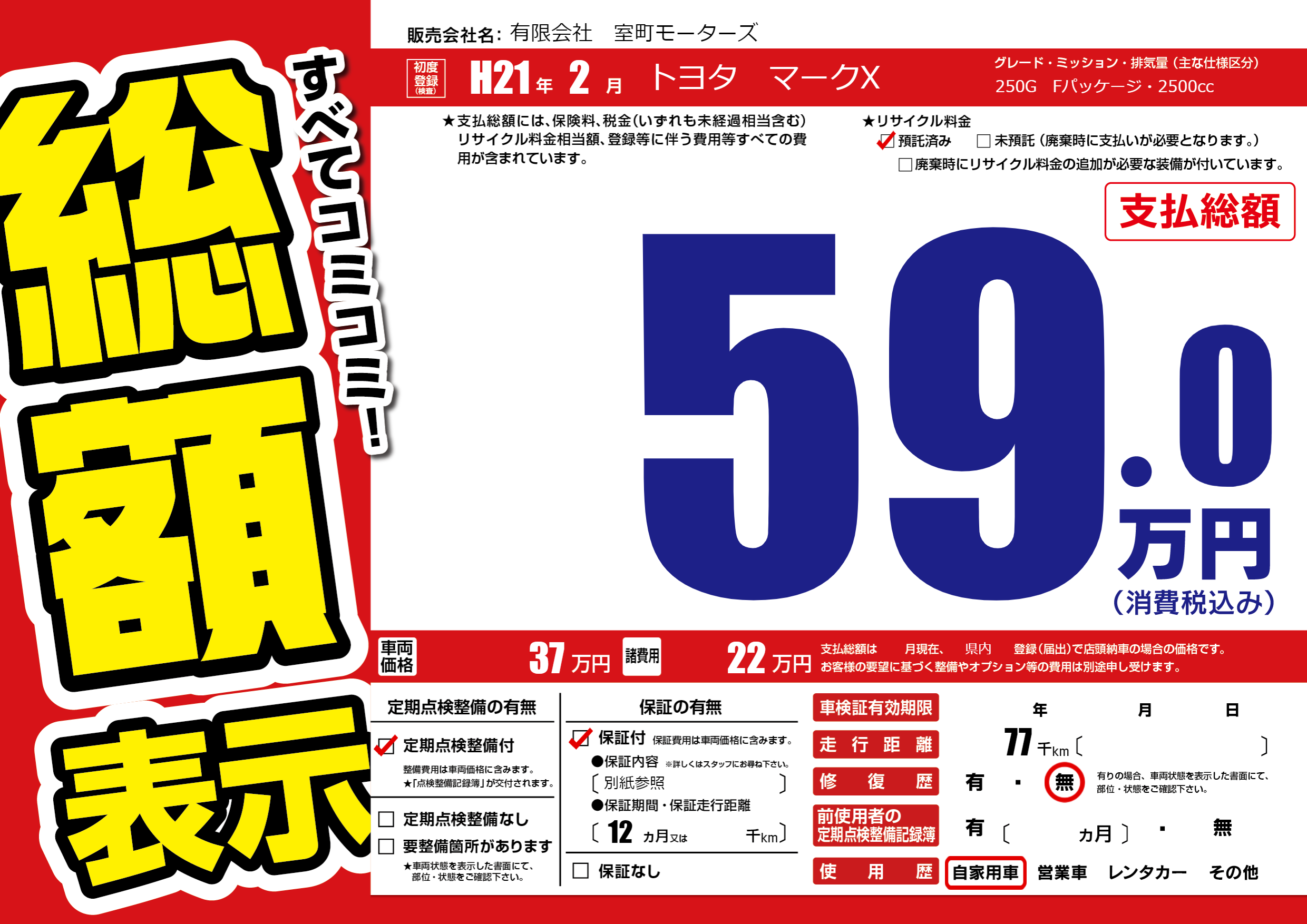 | 車名 | トヨタ マークX | グレード ミッション 排気量 |