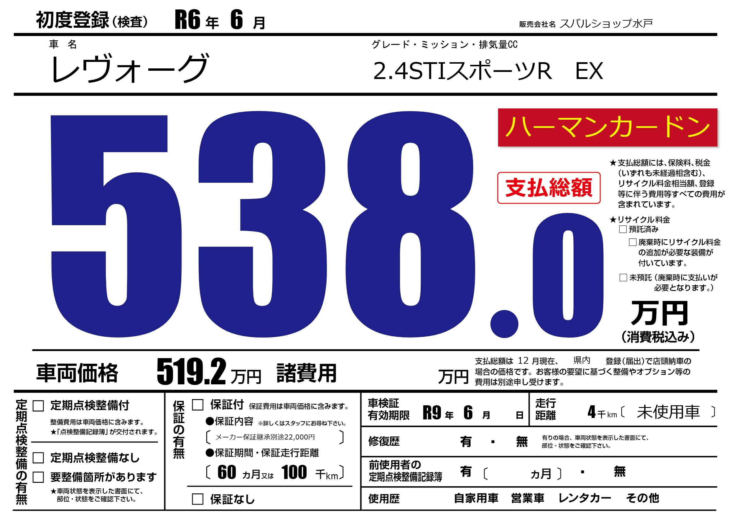 | 車名 | レヴォーグ | グレード ミッション 排気量 |
