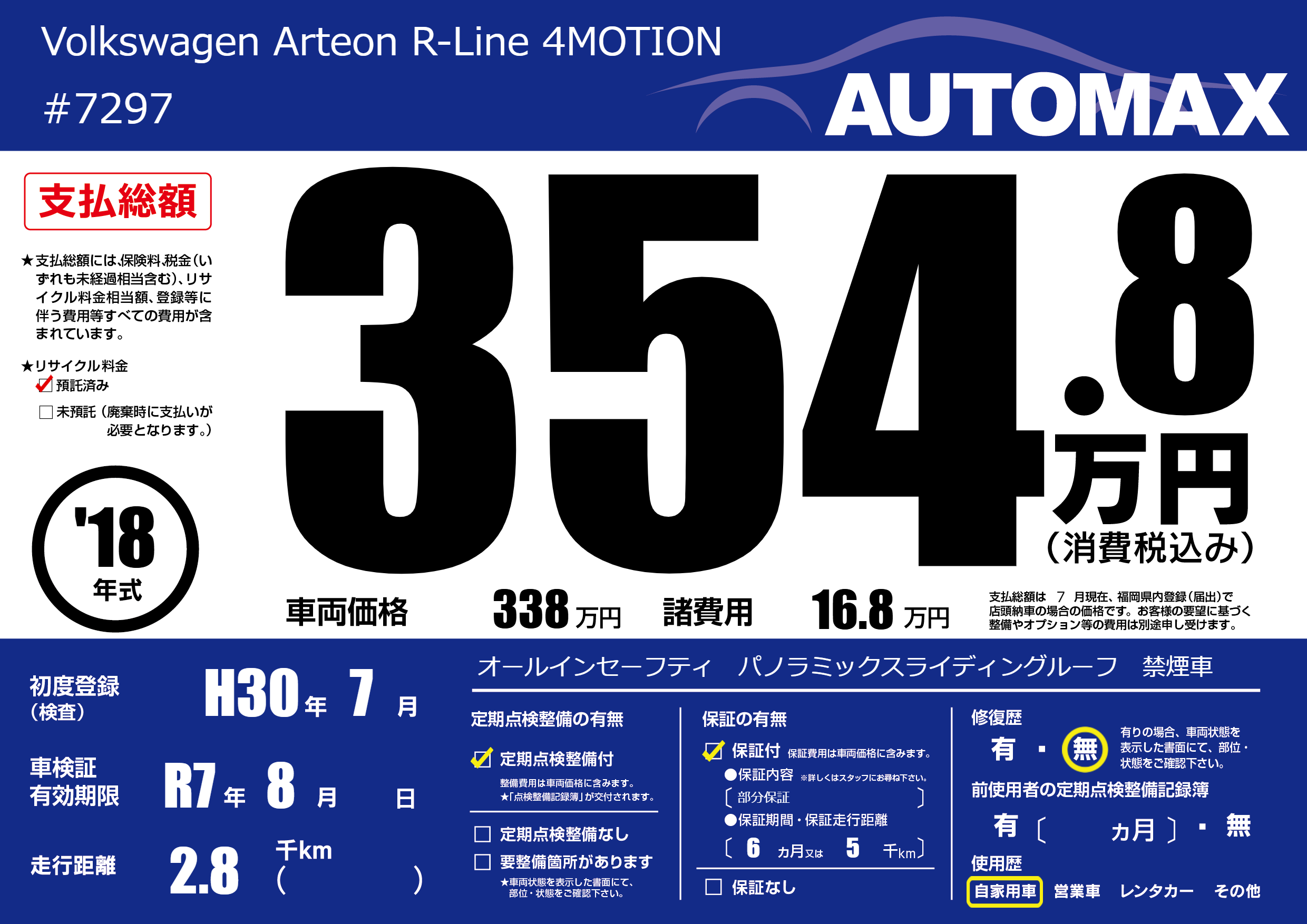 | 車名 | Volkswagen Arteon R-Line 4MOTION | グレード ミッション 排気量 |