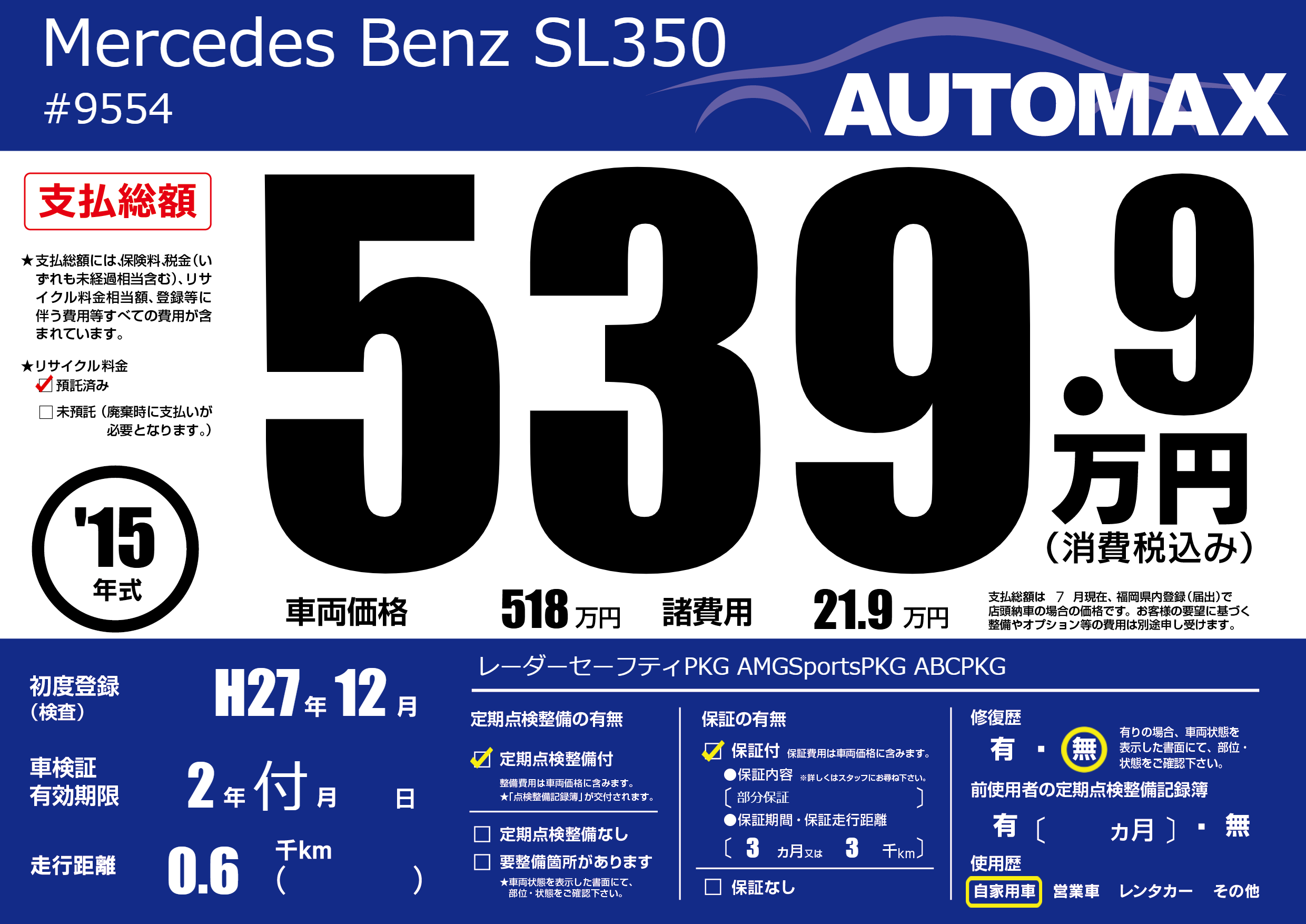 | 走行キロ | - | 初年度登録 | H27年12月 |