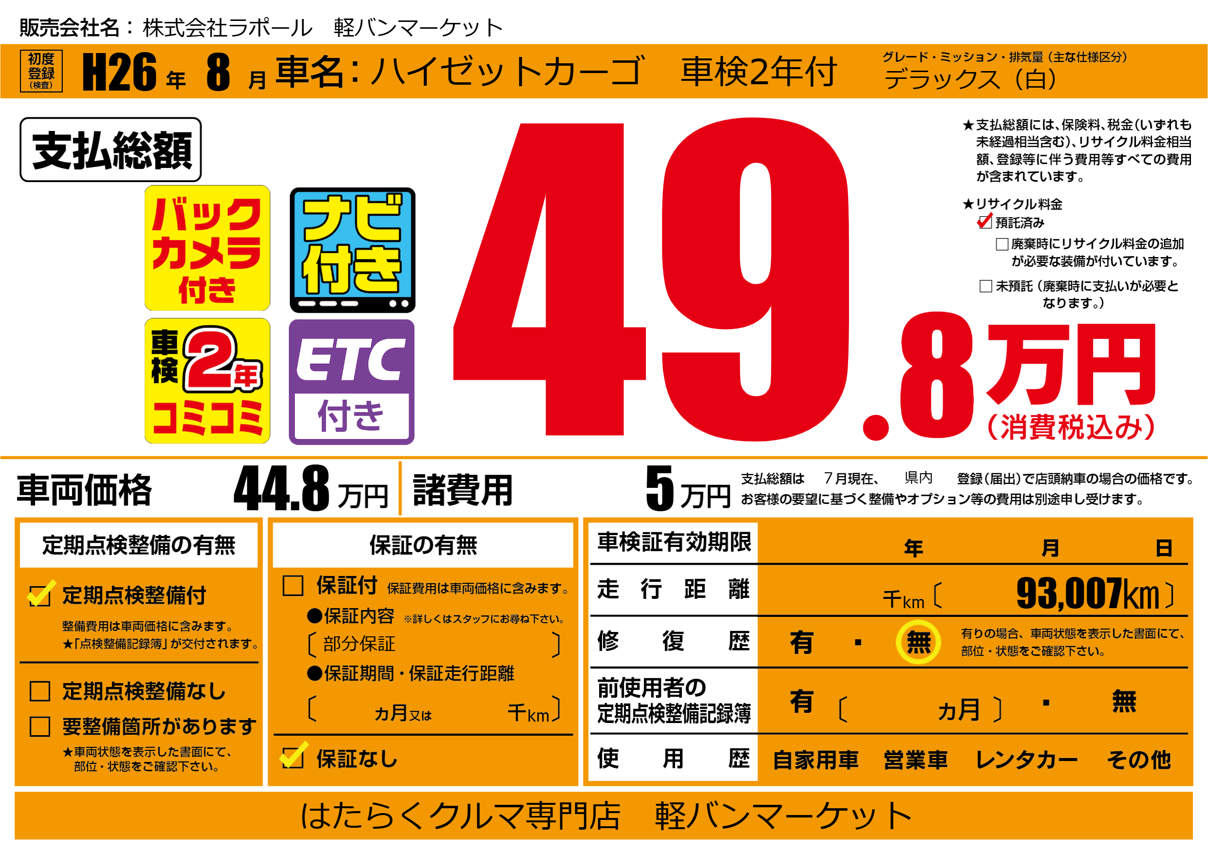 | 車名 | ハイゼットカーゴ 車検2年付 | グレード ミッション 排気量 |