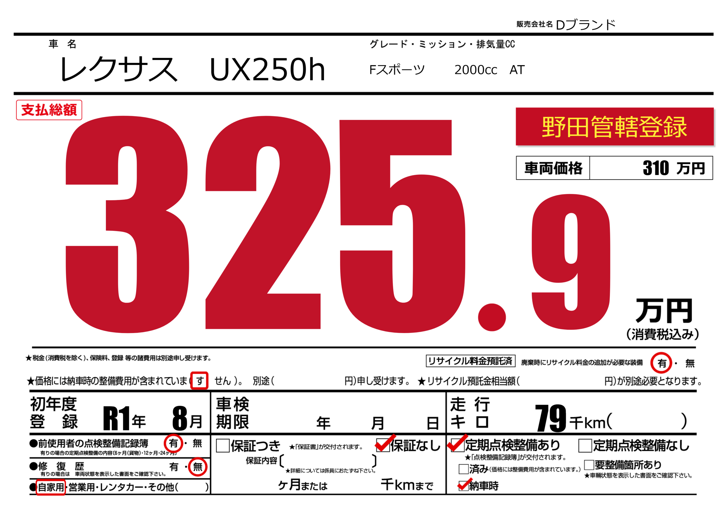 | 定期点検整備 | 定期点検整備あり 納車時あり | ||