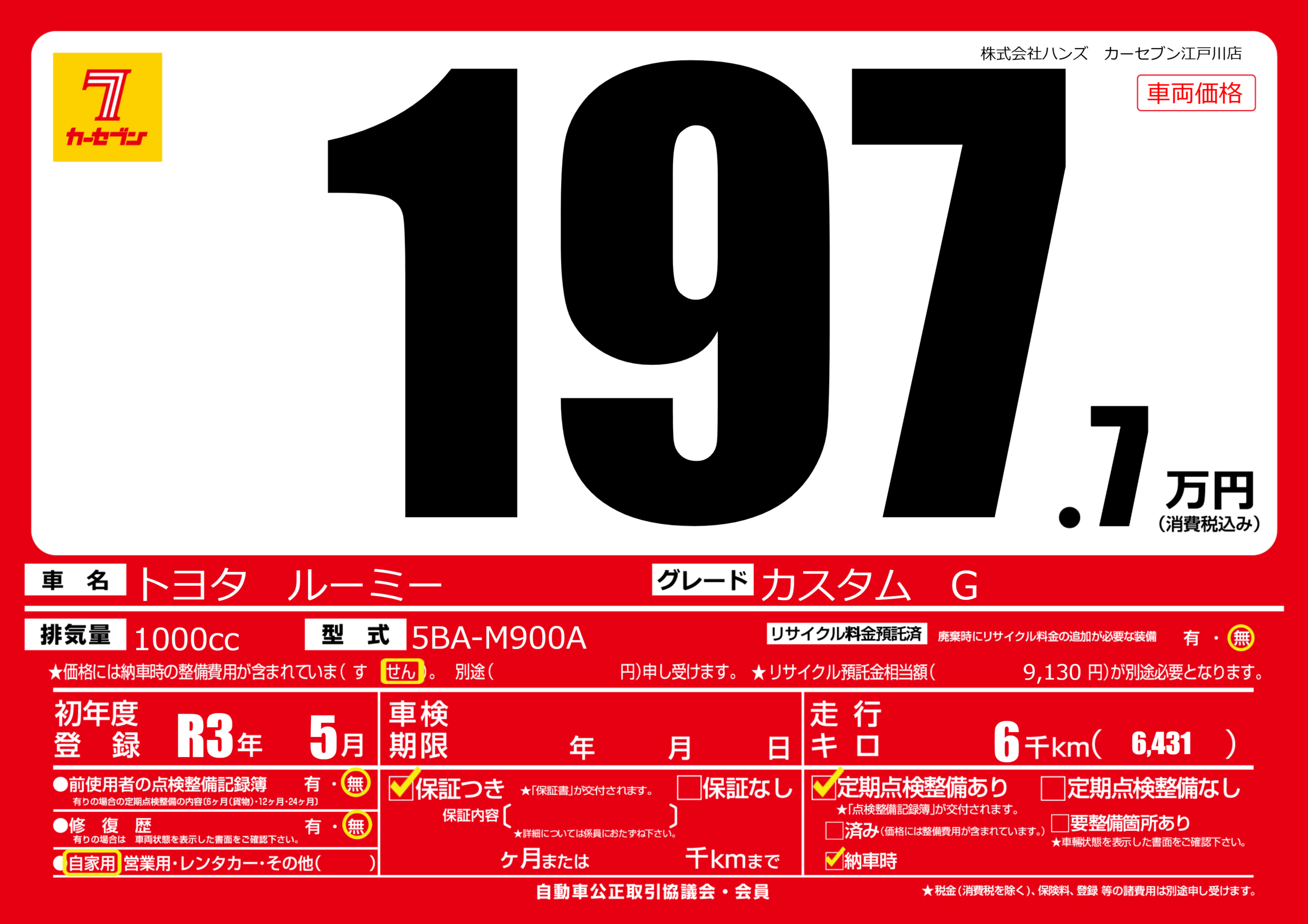 | 車名 | トヨタ ルーミー | グレード ミッション 排気量 |