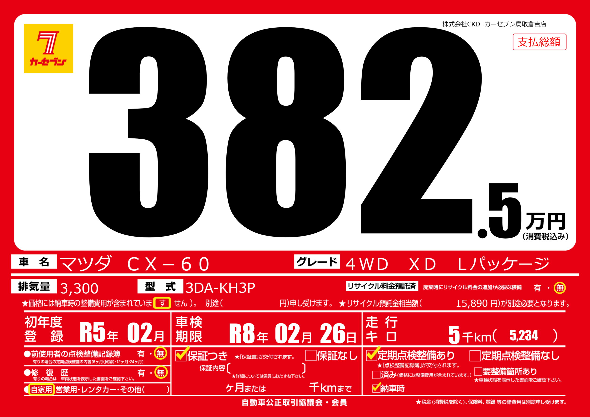| 車名 | マツダ CX-60 | グレード ミッション 排気量 |