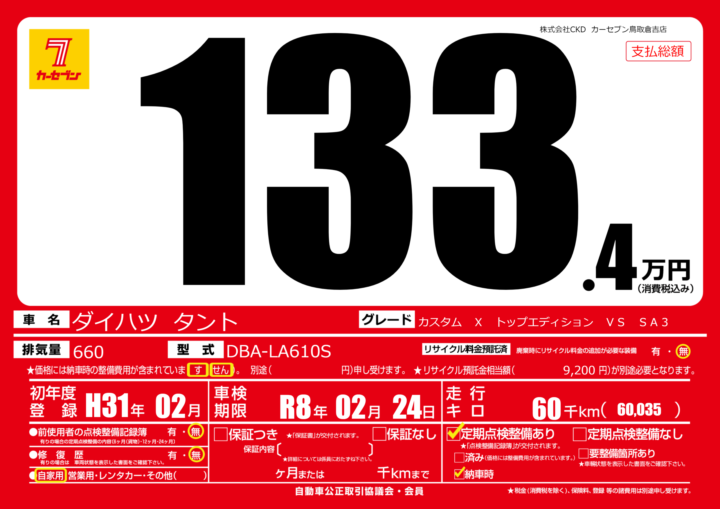 | 定期点検整備 | 定期点検整備あり 納車時あり | ||