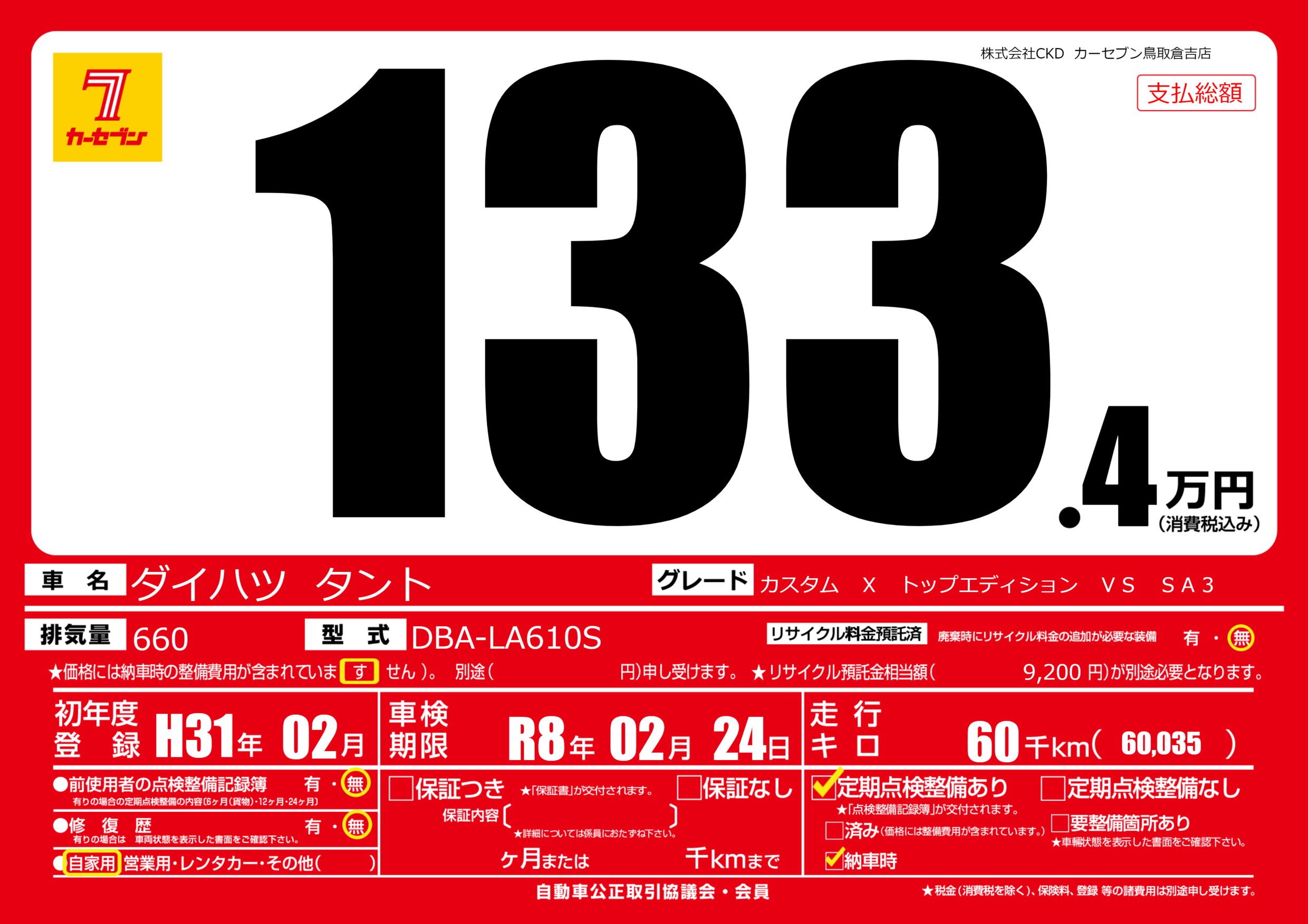 | 車名 | ダイハツ タント | グレード ミッション 排気量 |