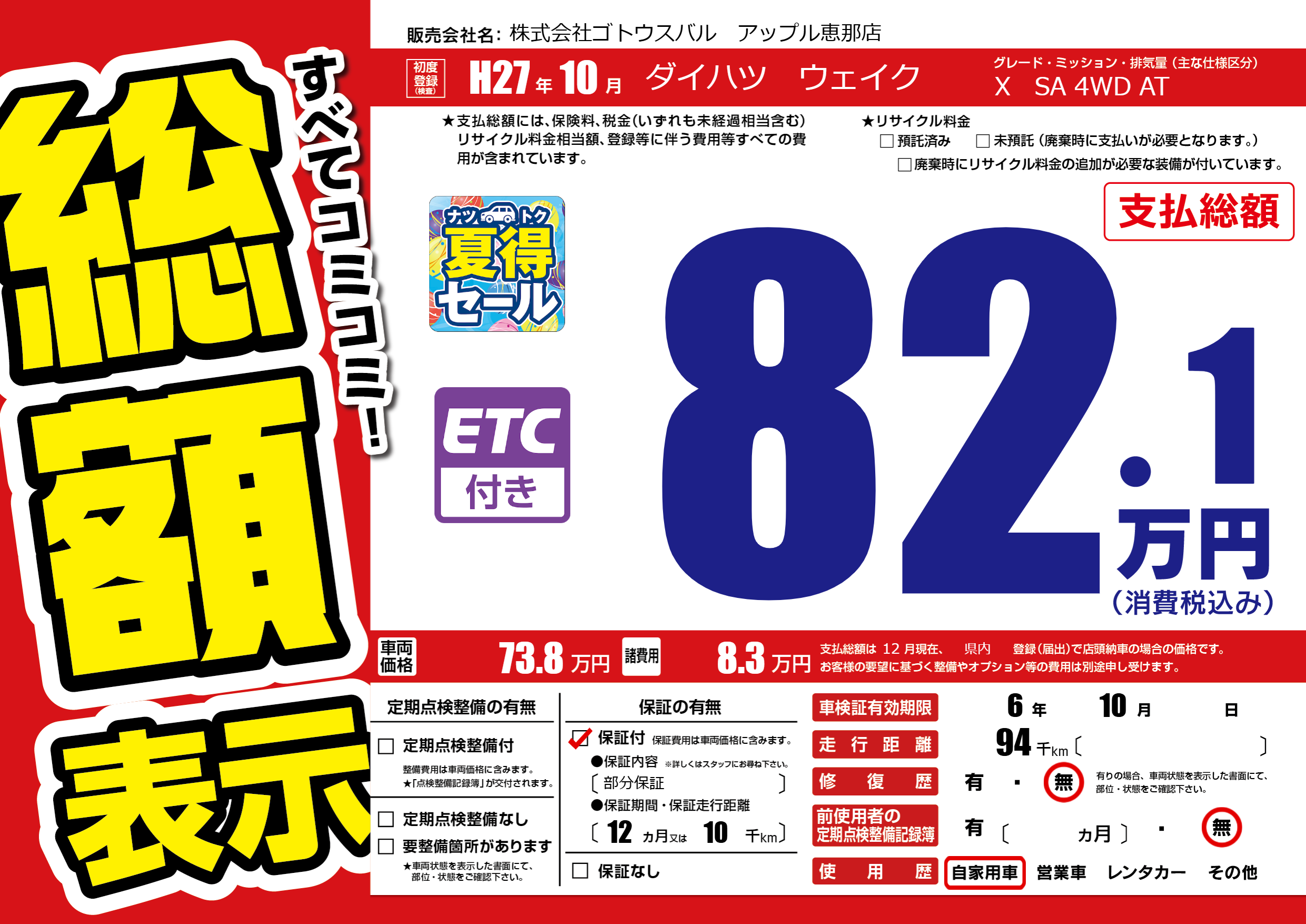 | 車名 | ダイハツ ウェイク | グレード ミッション 排気量 |