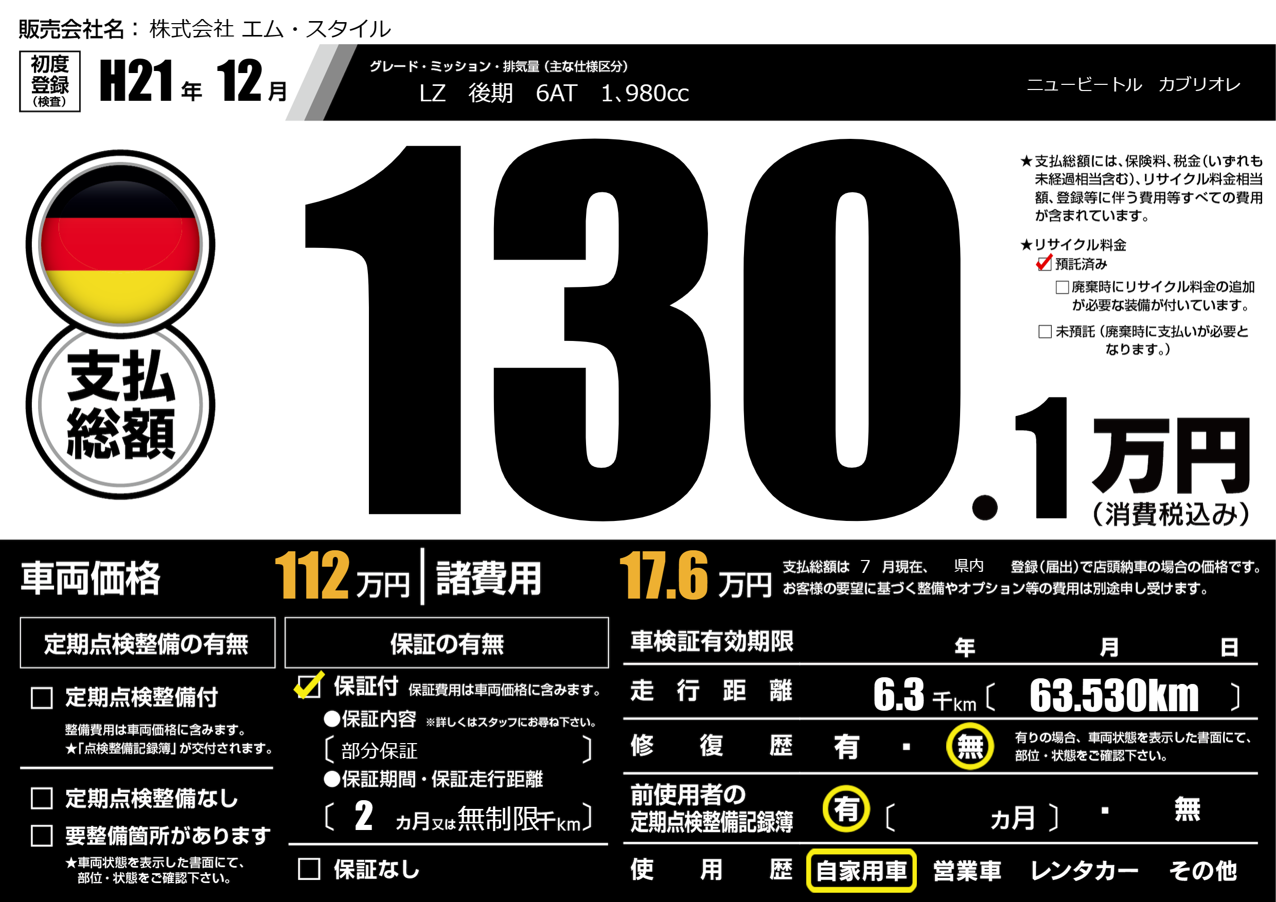 | 走行キロ | 0.6万km | 初年度登録 | H21年12月 |