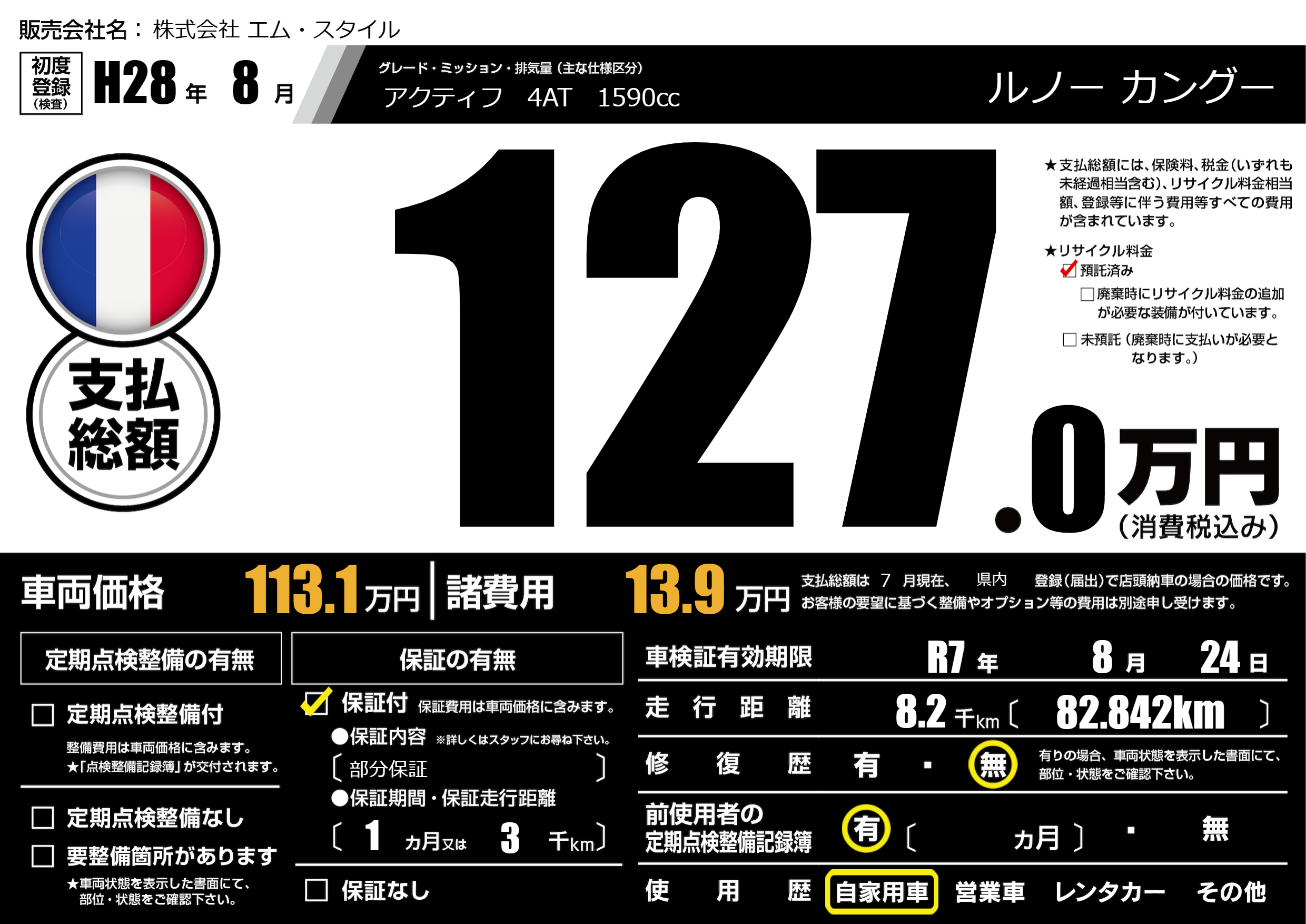 | 車名 | ルノー カングー | グレード ミッション 排気量 |