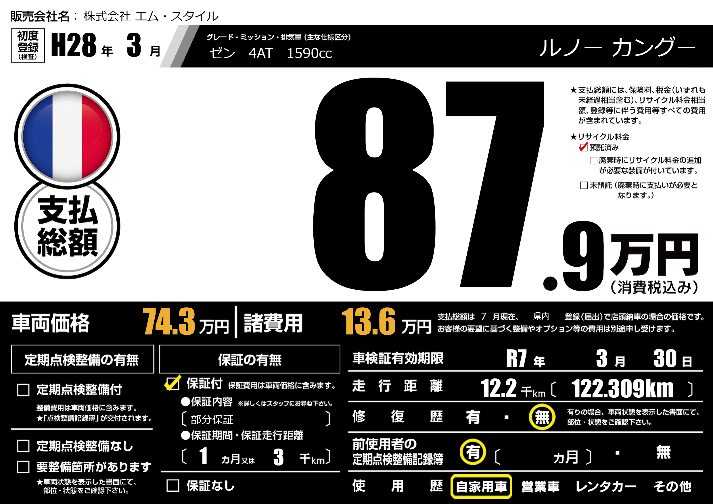 | 車名 | ルノー カングー | グレード ミッション 排気量 |