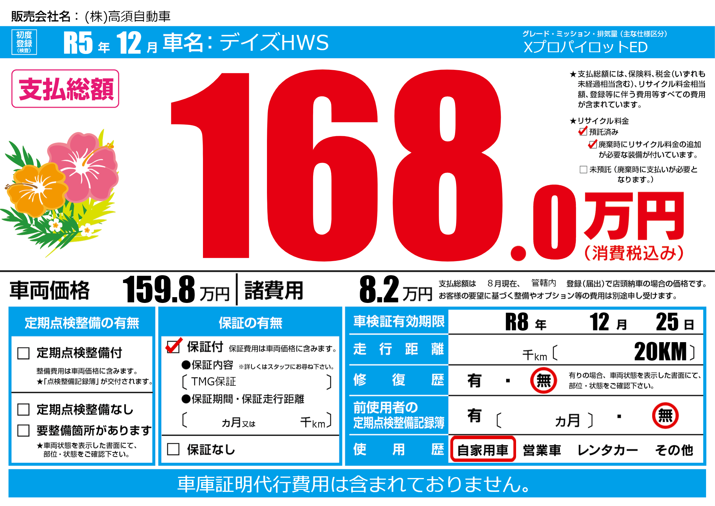 | 車名 | デイズHWS | グレード ミッション 排気量 |