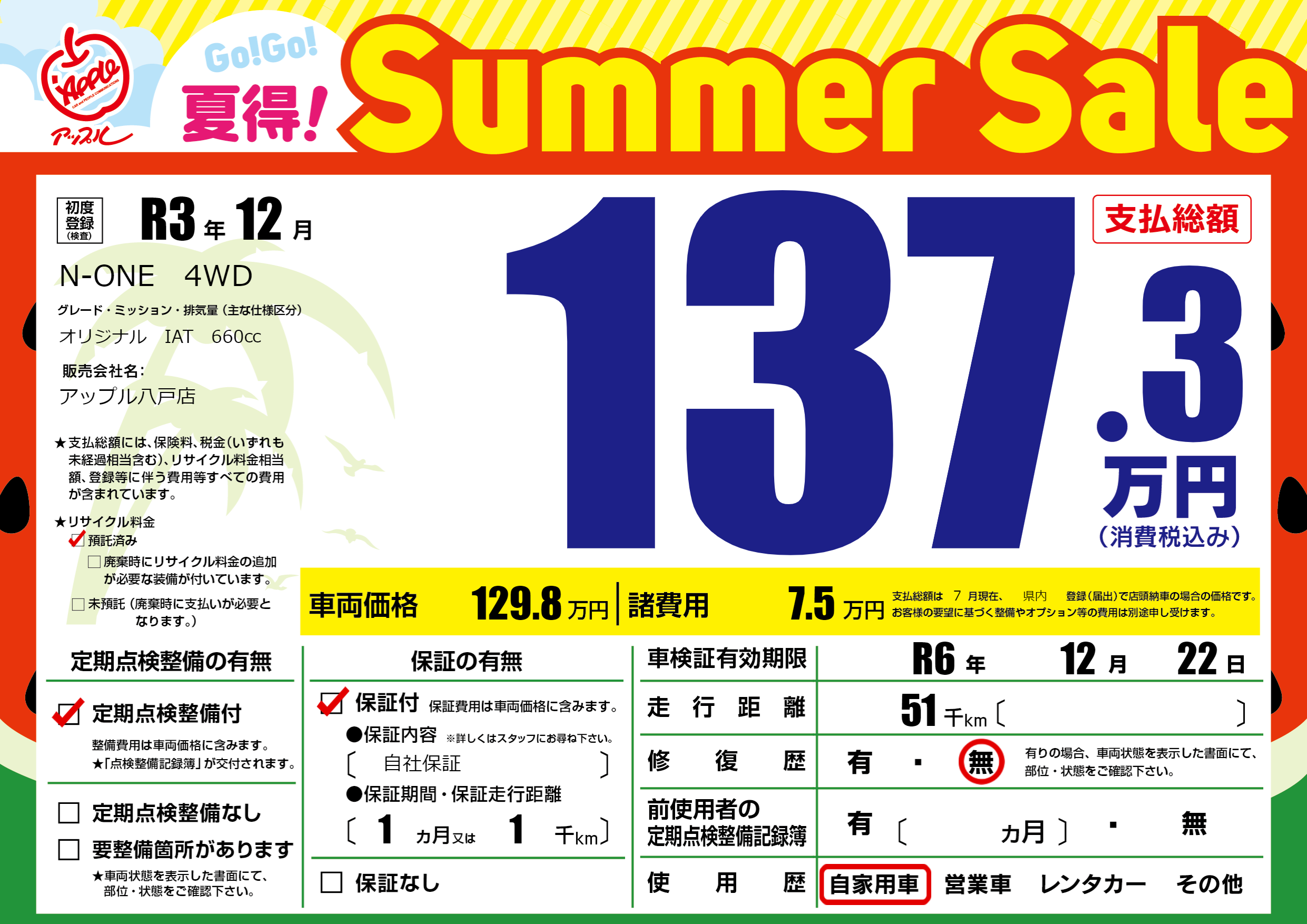 | 車名 | N-ONE 4WD | グレード ミッション 排気量 |