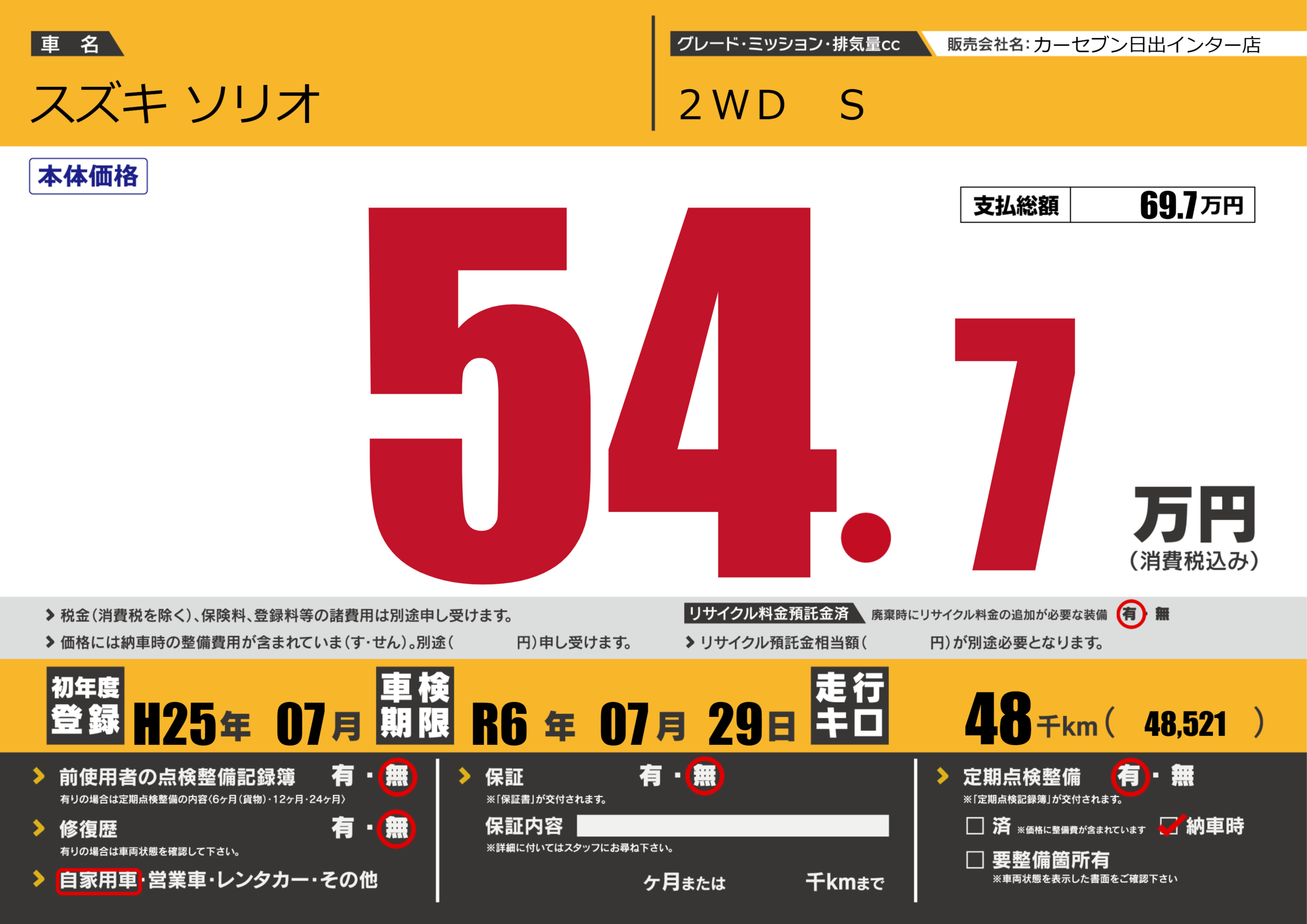 | 走行キロ | 4.8万km | 初年度登録 | H25年07月 |
