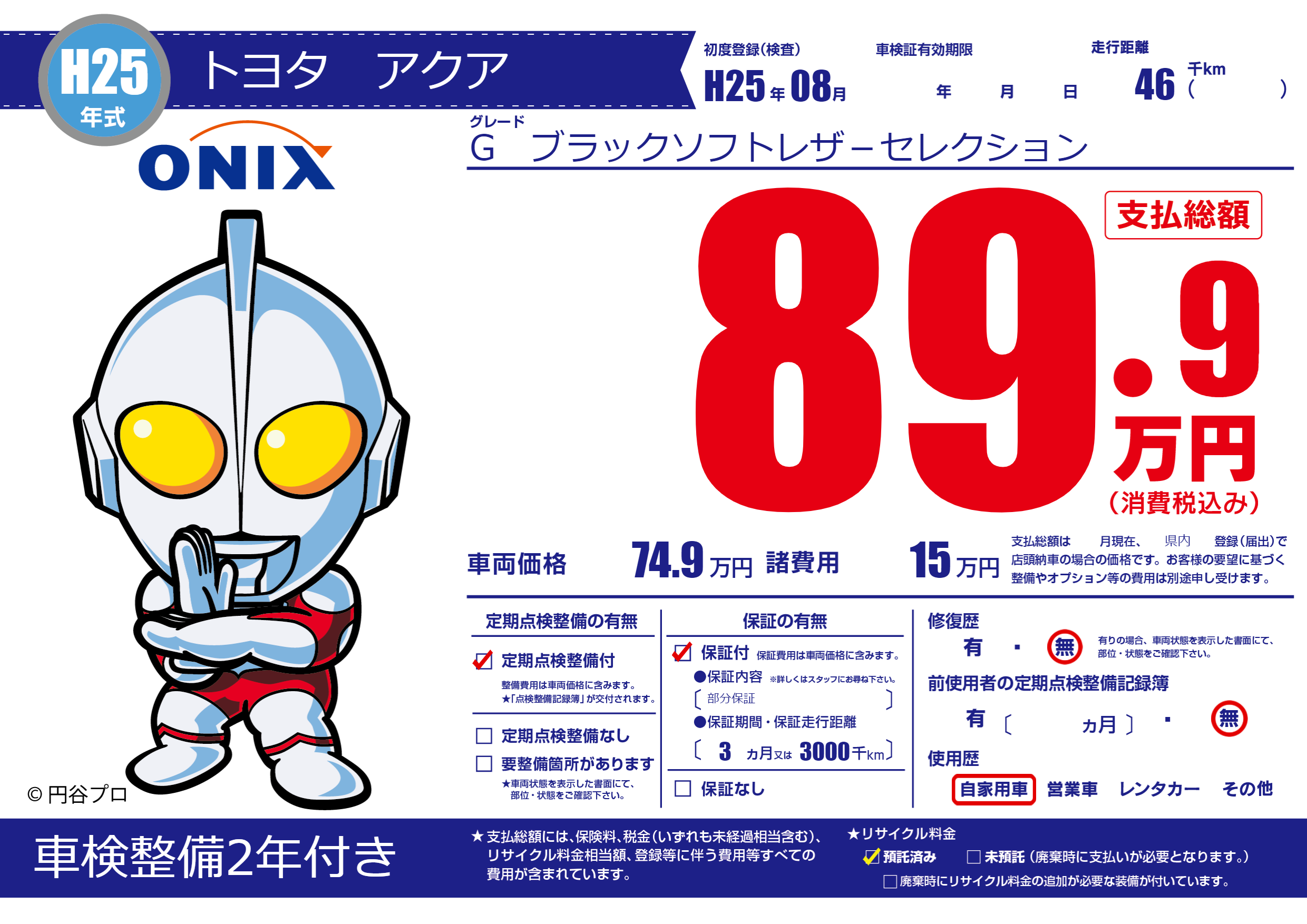| 車名 | トヨタ アクア | グレード ミッション 排気量 |