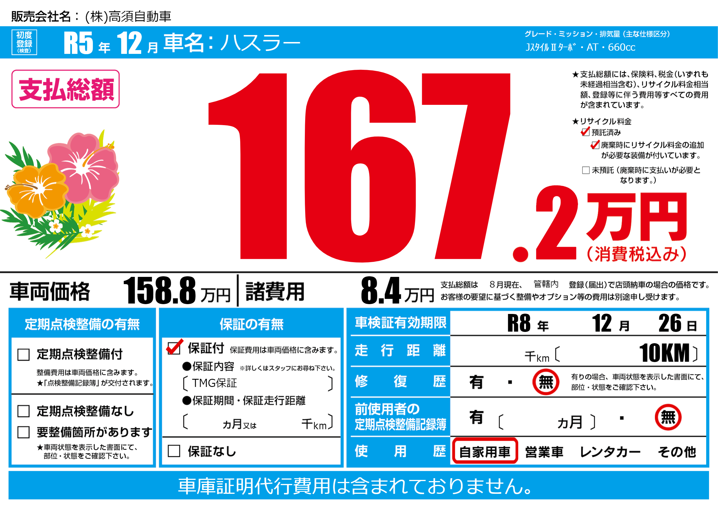 | 車名 | ハスラー | グレード ミッション 排気量 |