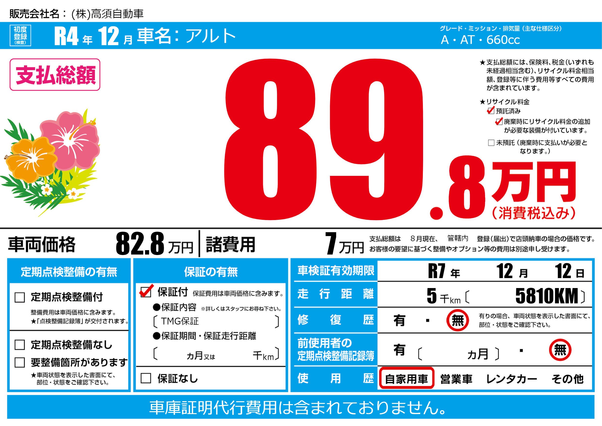 なし | 車検制限 | R7年12月12月 |