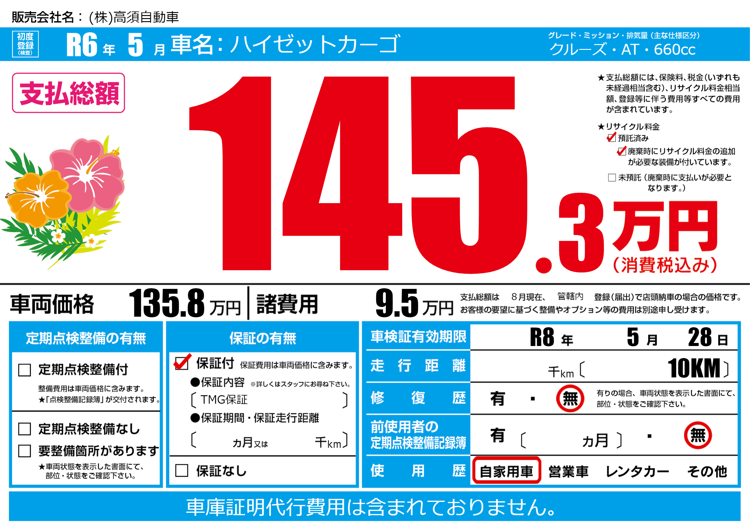 | 車名 | ハイゼットカーゴ | グレード ミッション 排気量 |