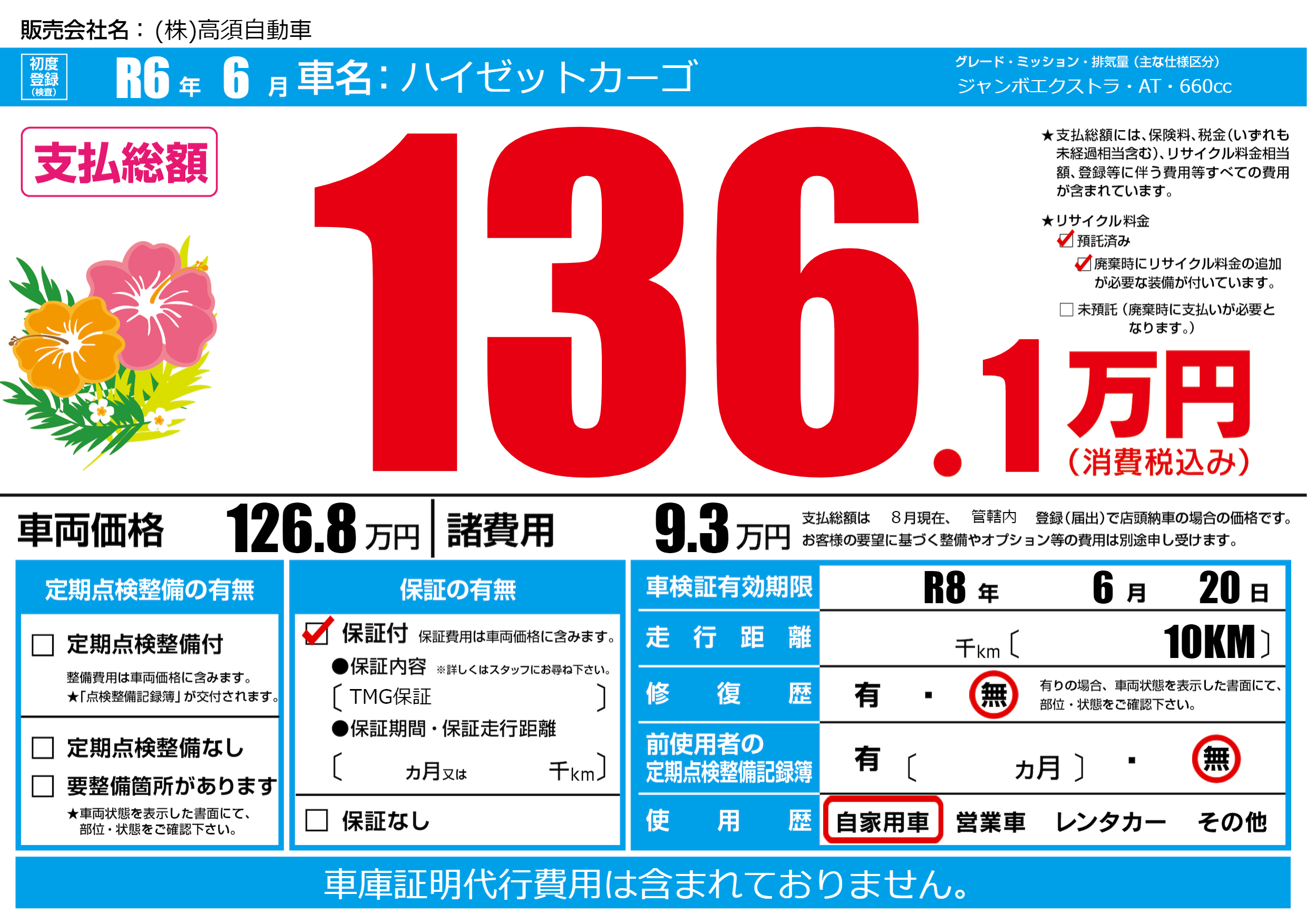 | 車名 | ハイゼットカーゴ | グレード ミッション 排気量 |