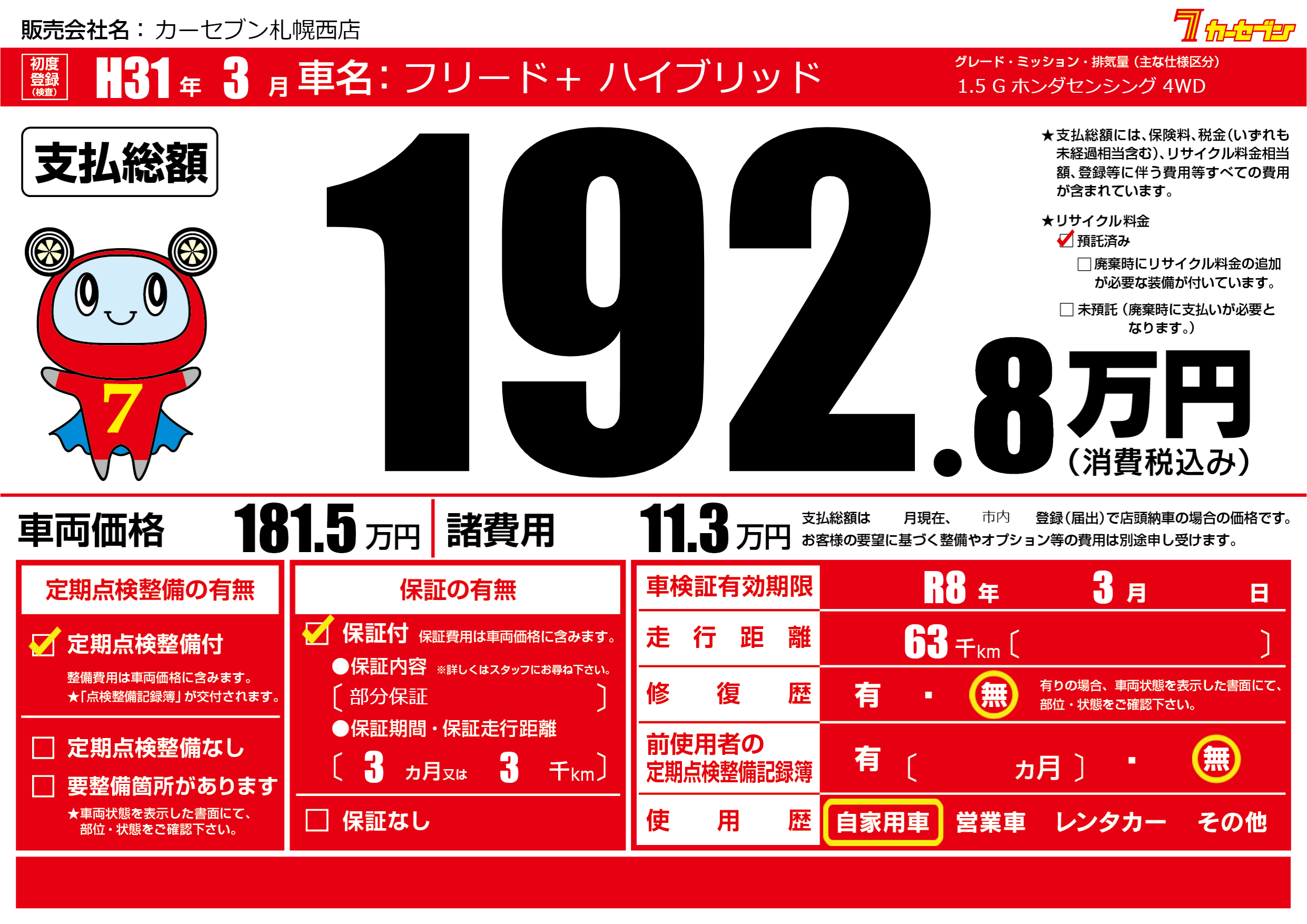 | 車検制限 | R8年 3月 - 日 | ||