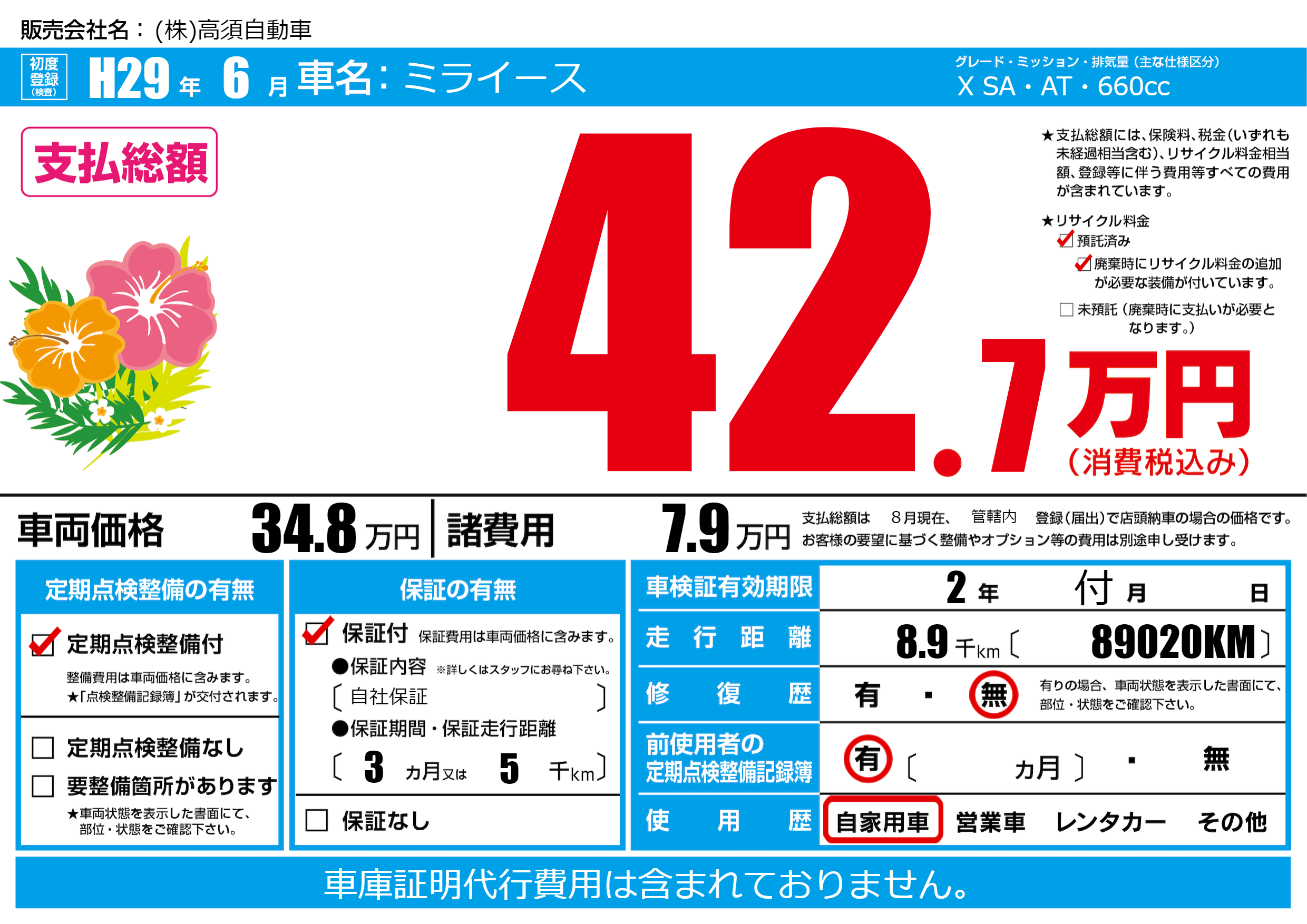 | 車名 | ミライース | グレード ミッション 排気量 |