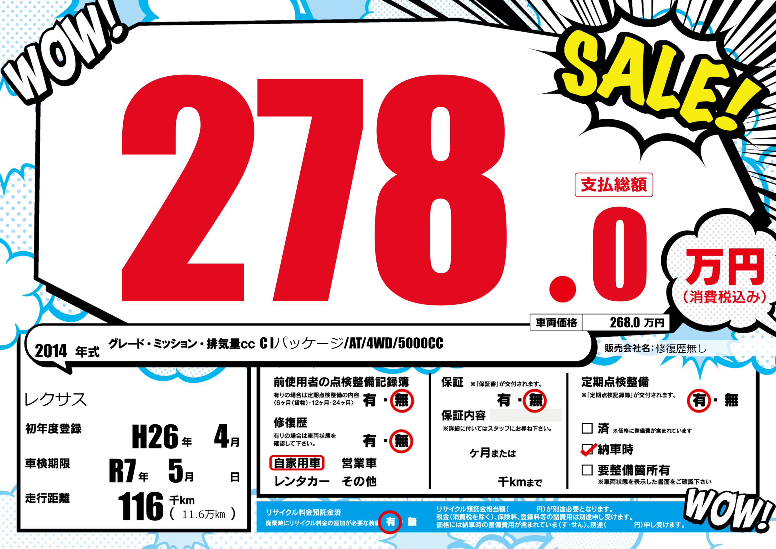 | 走行キロ | 11.6万km | 初年度登録 | H26年4月 |
