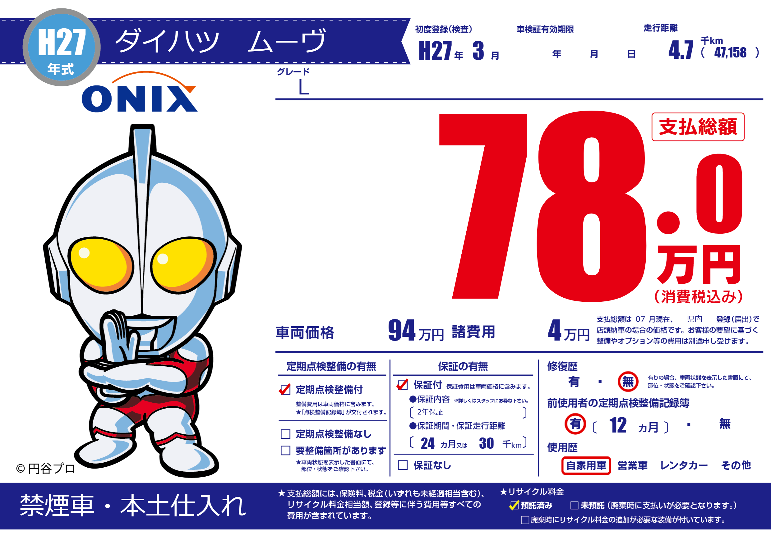 | 走行キロ | 0.4万km | 初年度登録 | H27年3月 |