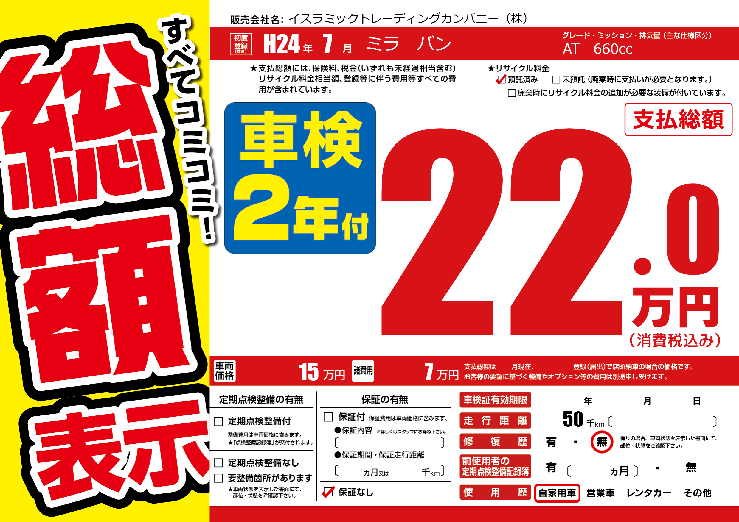 | 車名 | ミラ バン | グレード ミッション 排気量 |