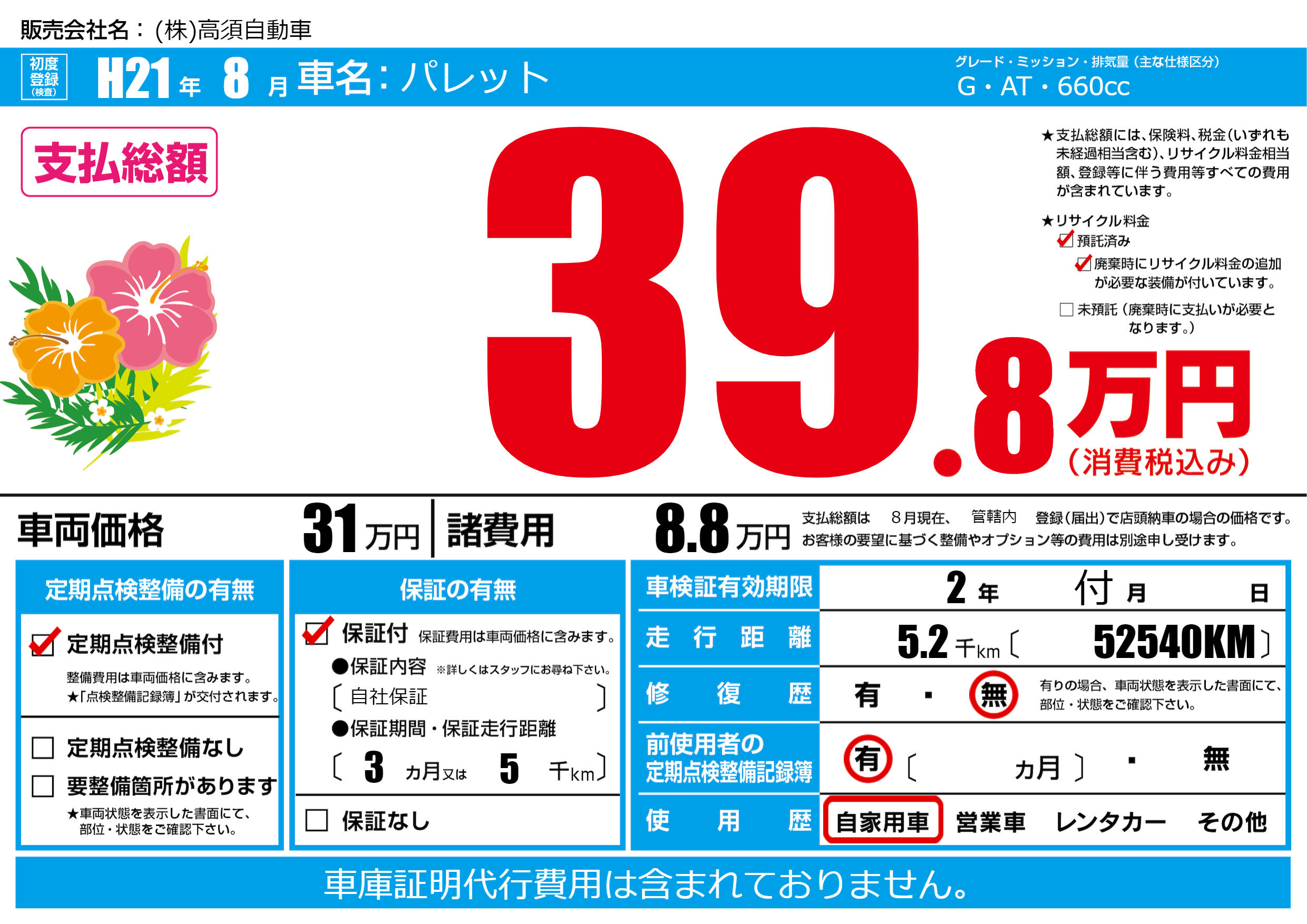 | 走行キロ | 0.5万km | 初年度登録 | H21年8月 |
