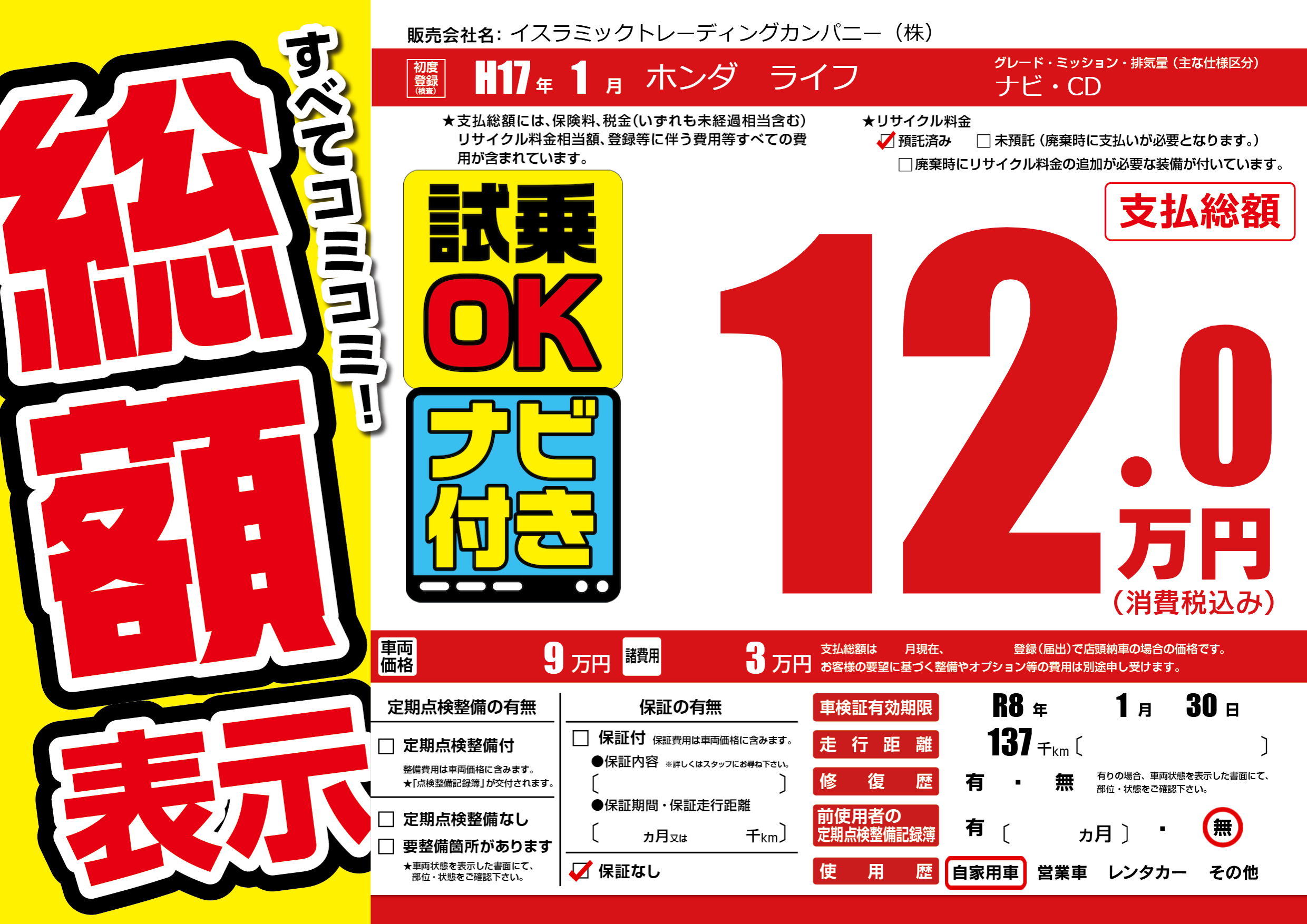 | 走行キロ | 13.7万km | 初年度登録 | H17年1月 |