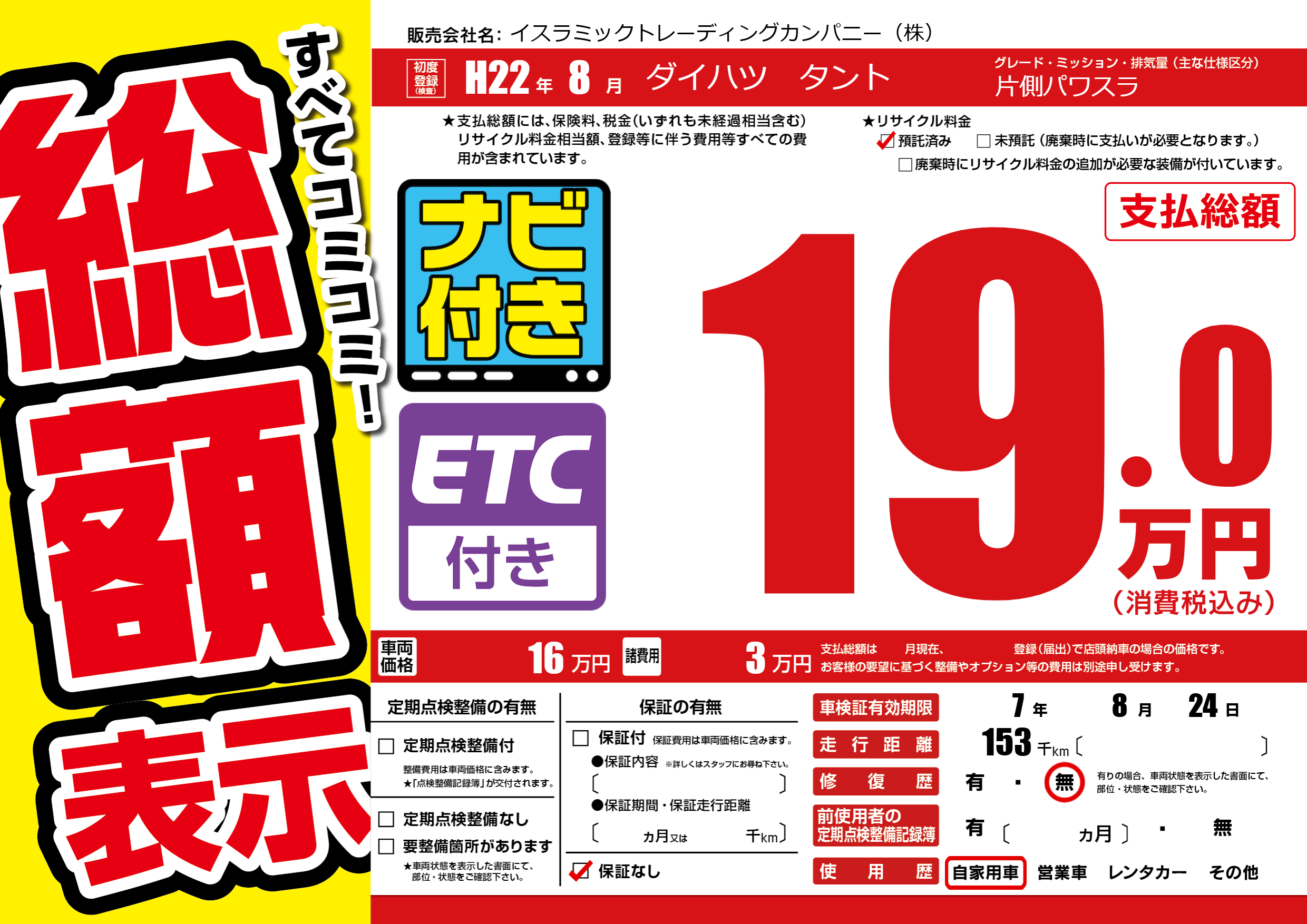 | 車名 | ダイハツ タント | グレード ミッション 排気量 |