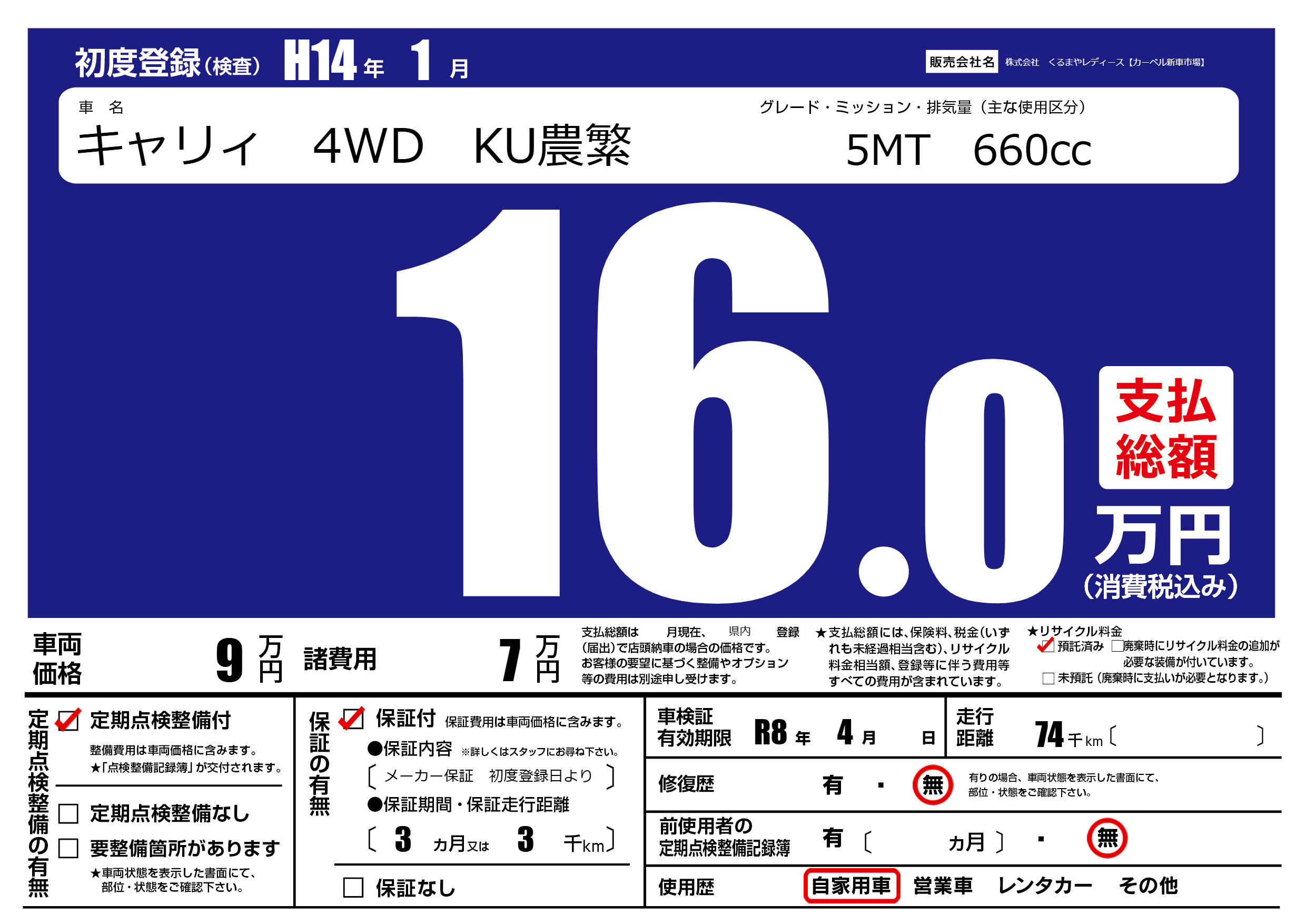 | 走行キロ | 7.4万km | 初年度登録 | H14年1月 |