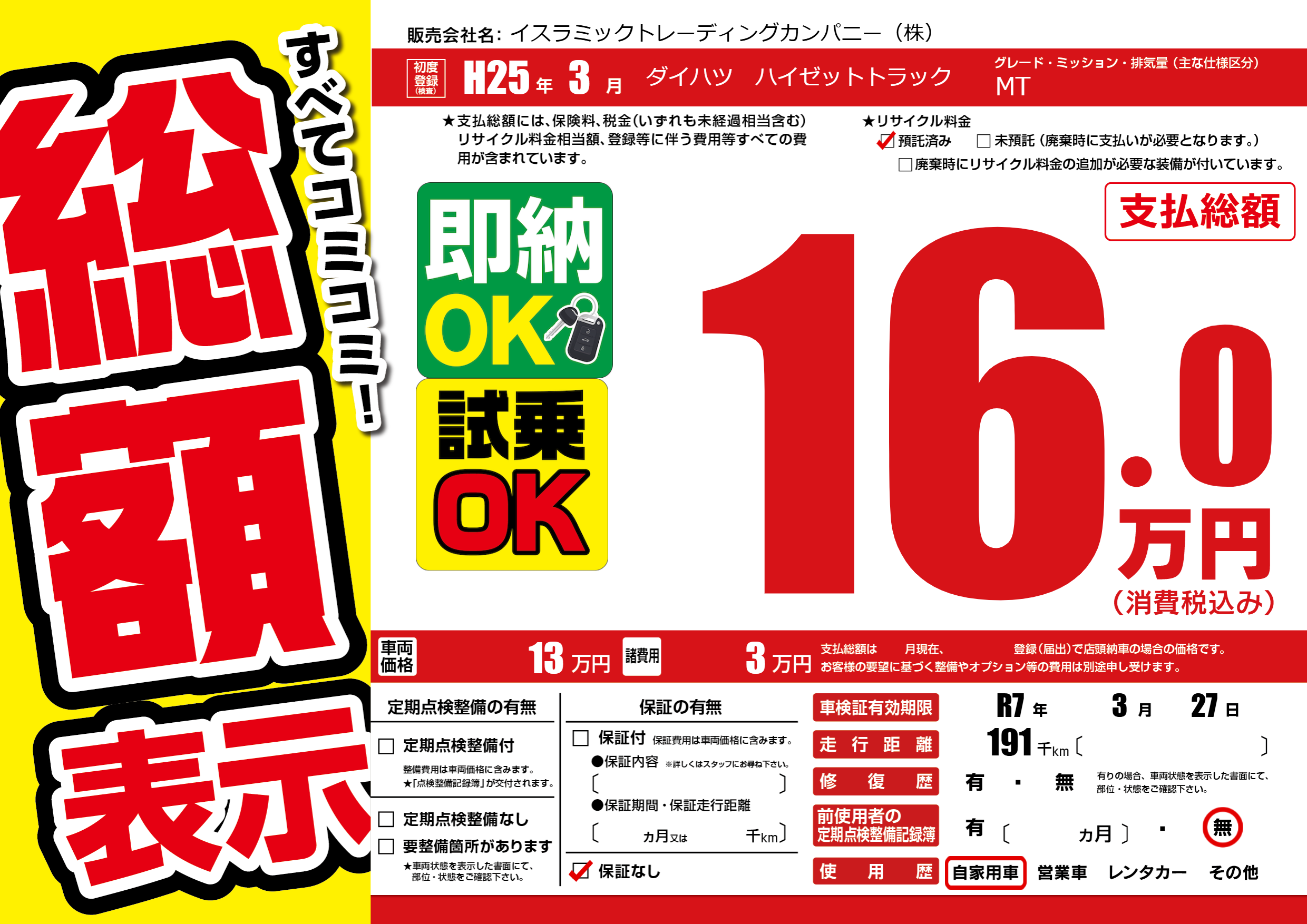 | 走行キロ | 19.1万km | 初年度登録 | H25年3月 |