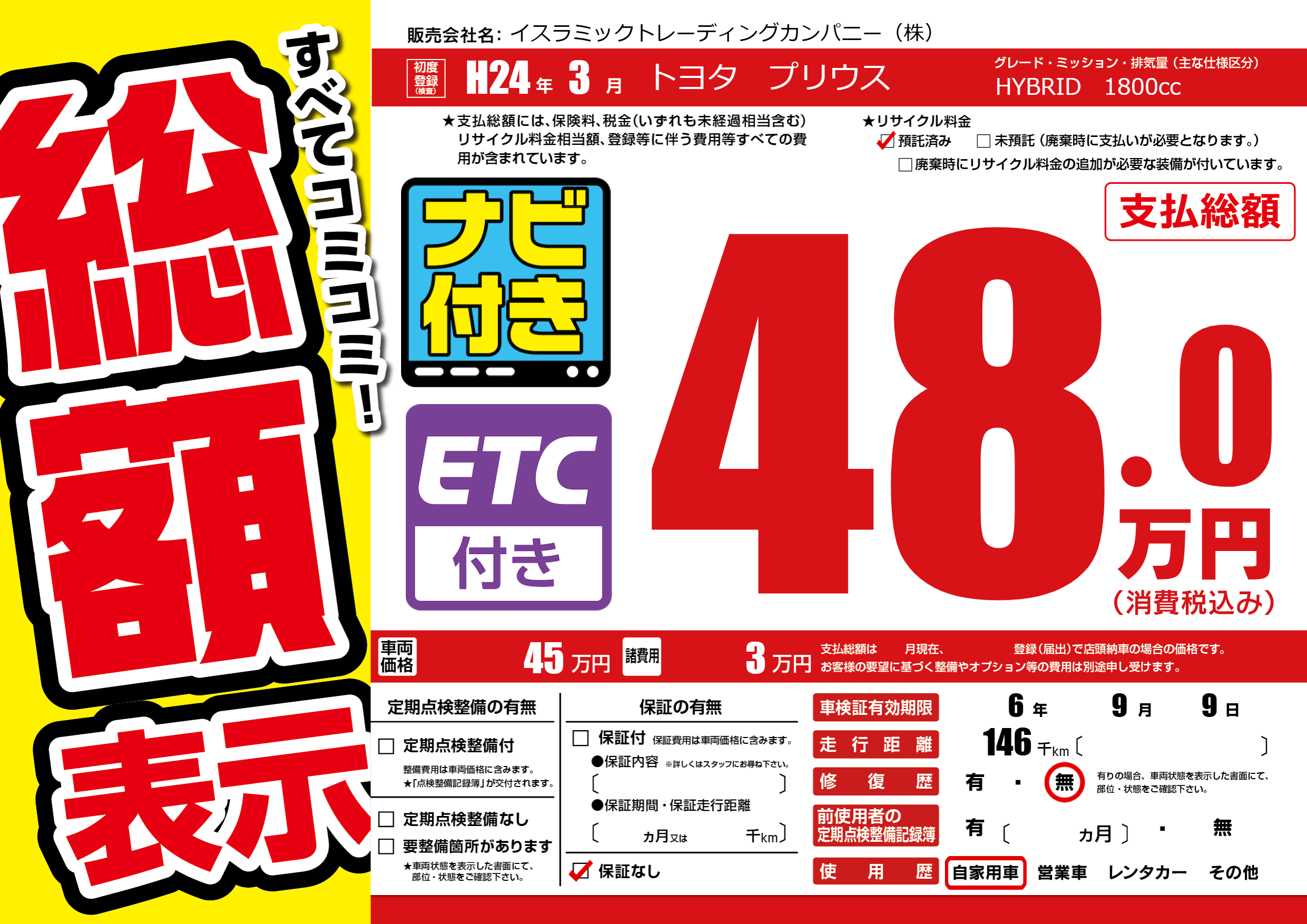 | 車名 | トヨタ プリウス | グレード ミッション 排気量 |