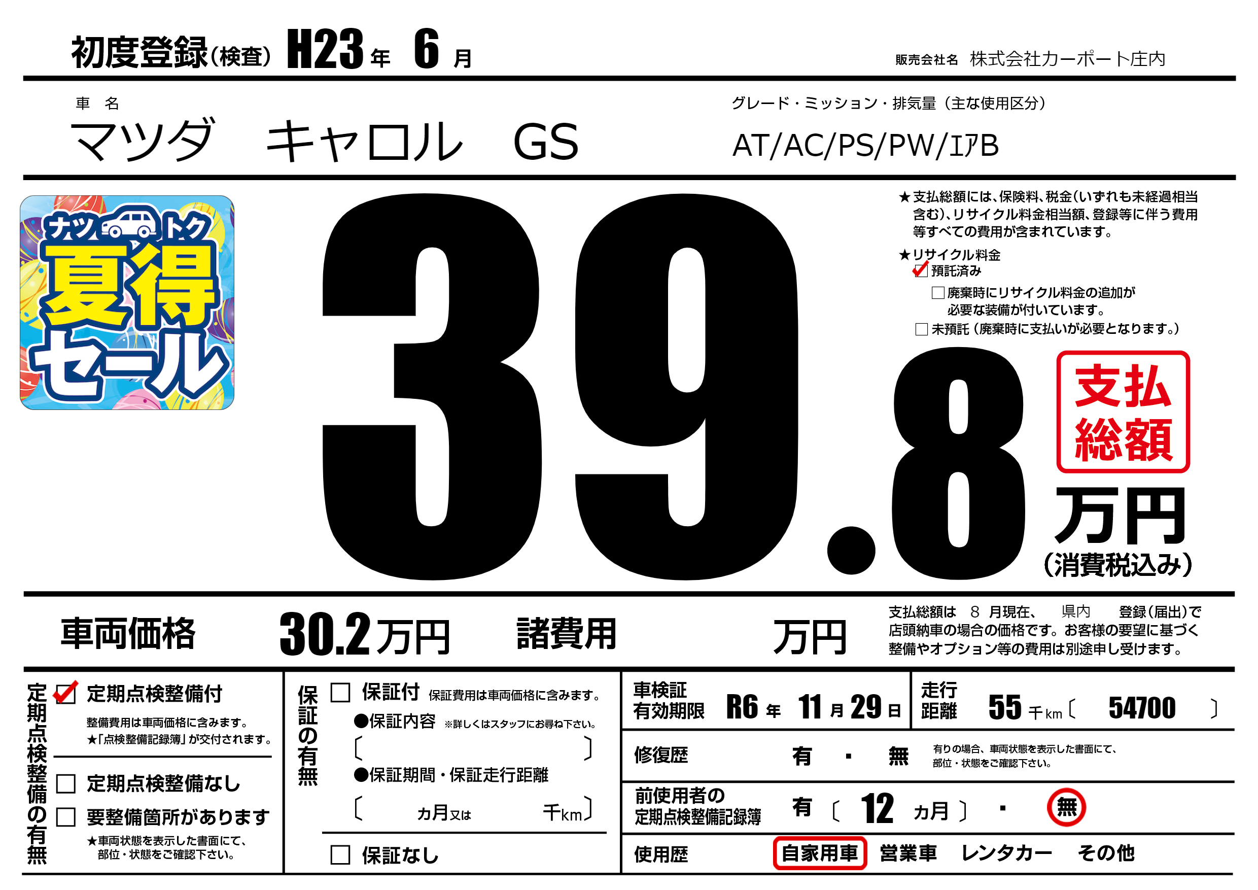 | 車名 | マツダ キャロル GS | グレード ミッション 排気量 |
