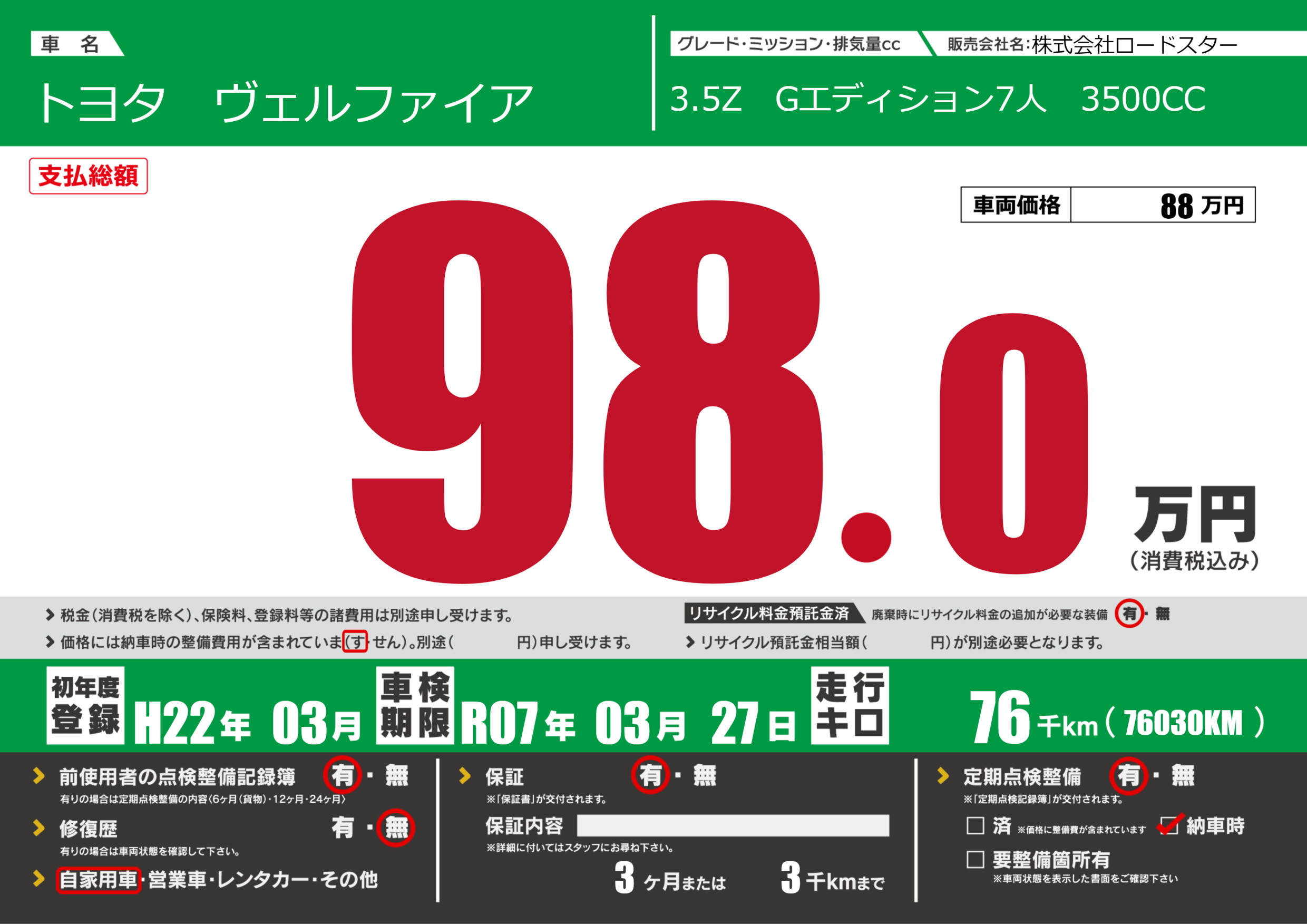 | 走行キロ | 7.6万km | 初年度登録 | H22年03月 |