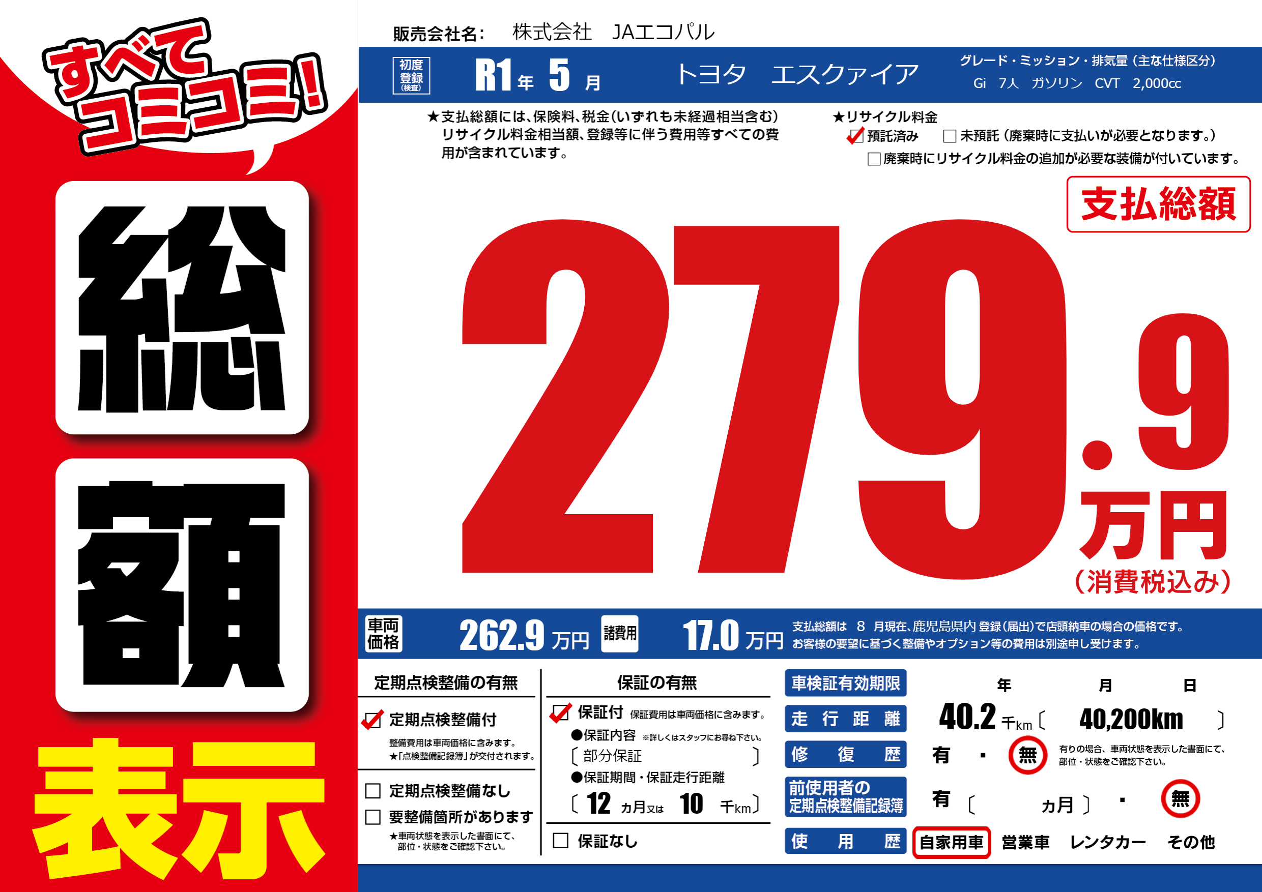 | 車名 | トヨタ エスクァイア | グレード ミッション 排気量 |