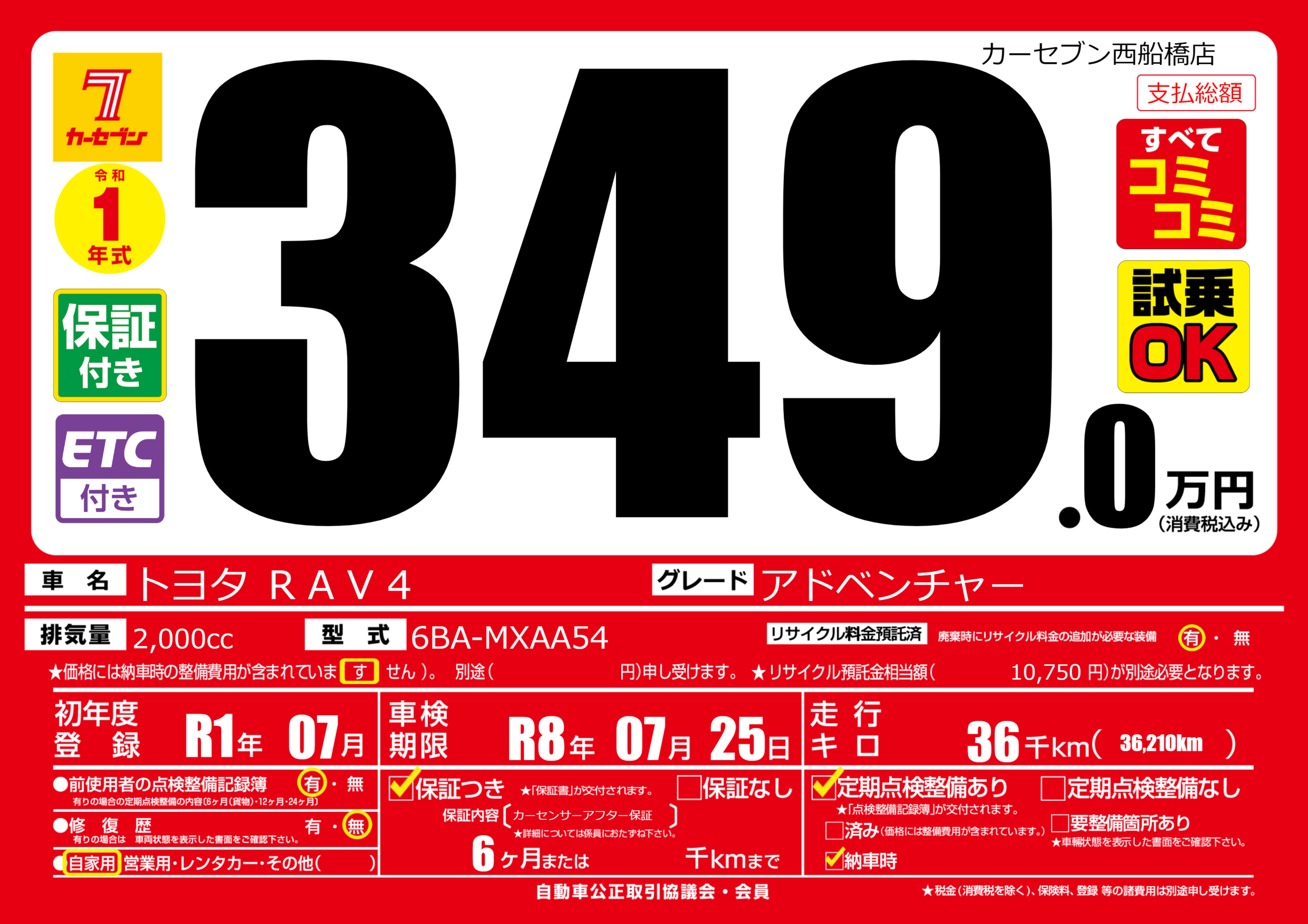 | 走行キロ | 3.6万km | 初年度登録 | R1年07月 |