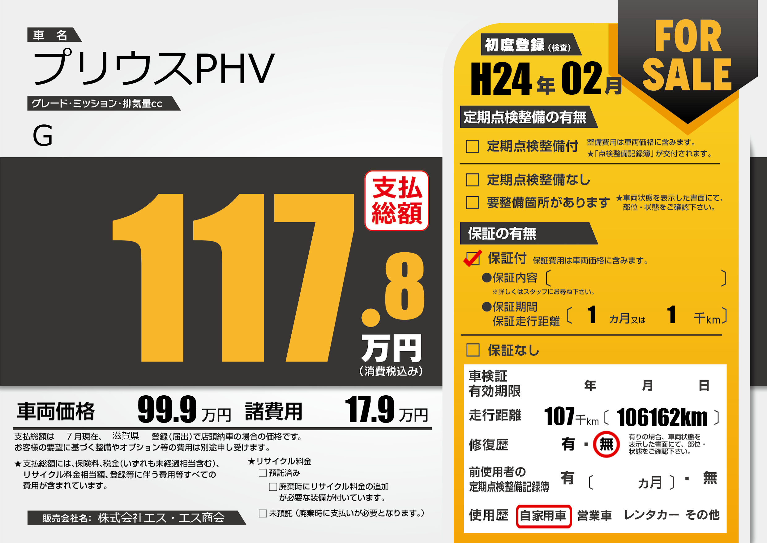 | 車名 | プリウスPHV | グレード ミッション 排気量 |