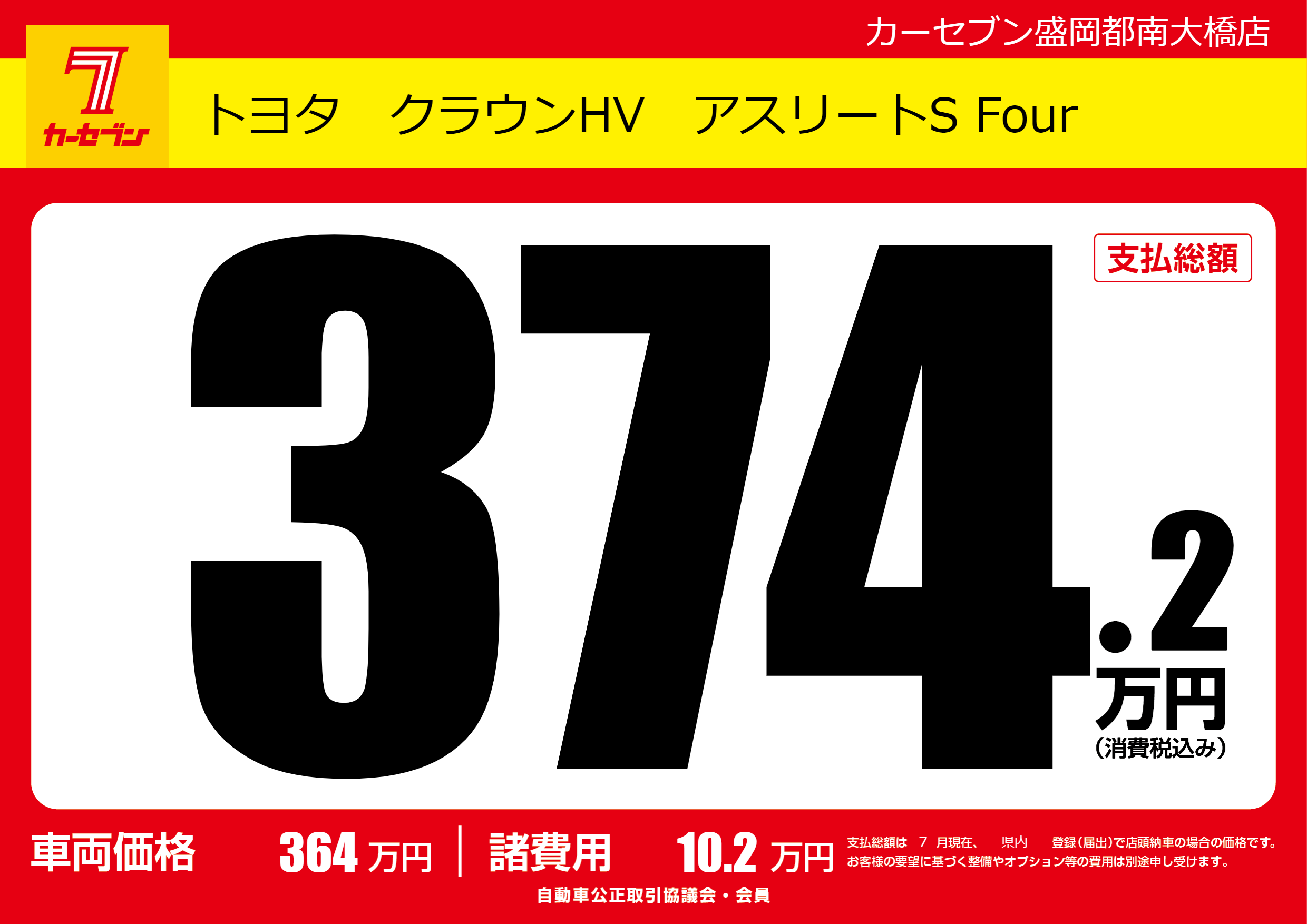 | 車名 | トヨタ クラウンHV アスリートS Four | グレード ミッション 排気量 |